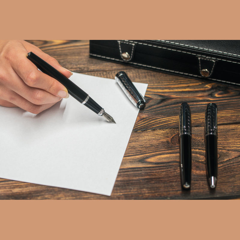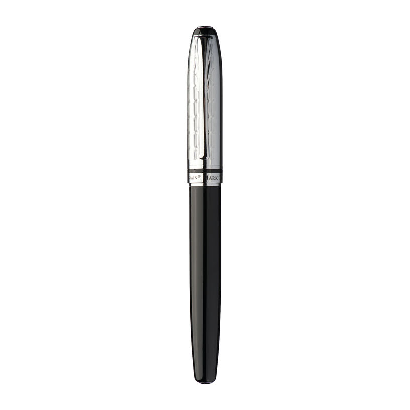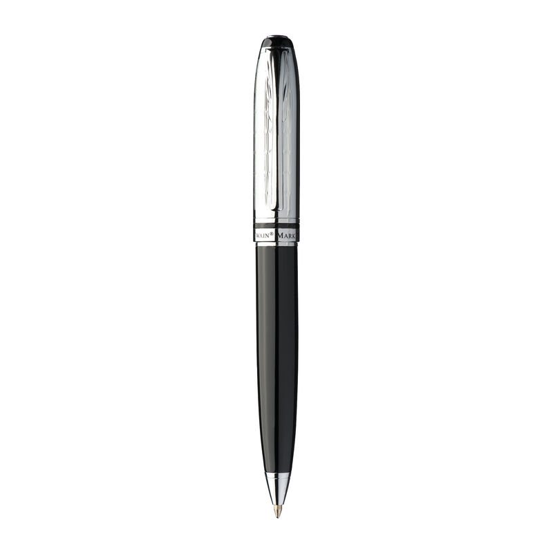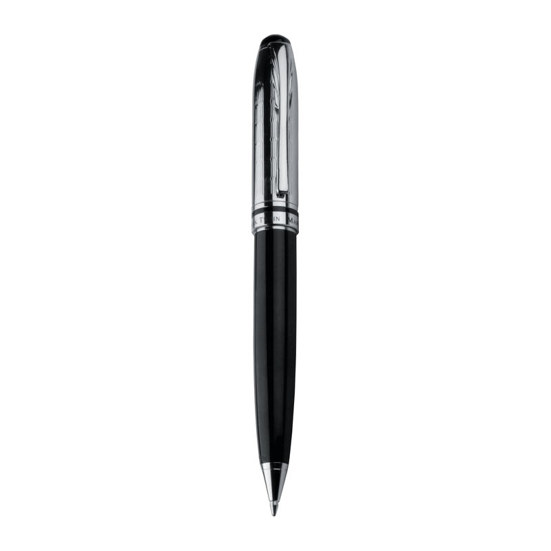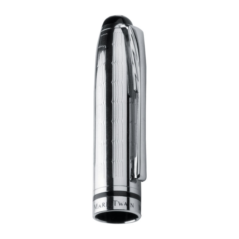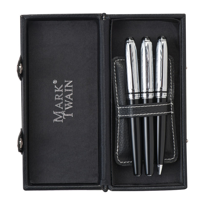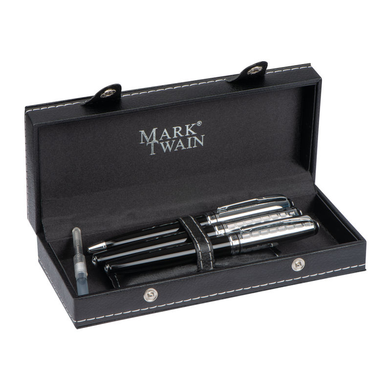Mark Twain - 3-piece metal writing set consisting of a fountain pen including refillable cartridge, a ball pen with black-writing large metal refill, and a blue-writing rollerball, it comes in a nice box with white seams. We will engrave your logo onto the pens.