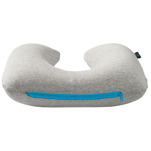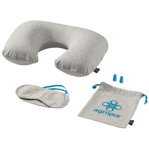 Soft travelset contains an inflatable neck pillow with bright blue zipper, eyemask with bright blue elastic, bright blue soft earplugs and a soft pouch with bright blue drawstring closure.