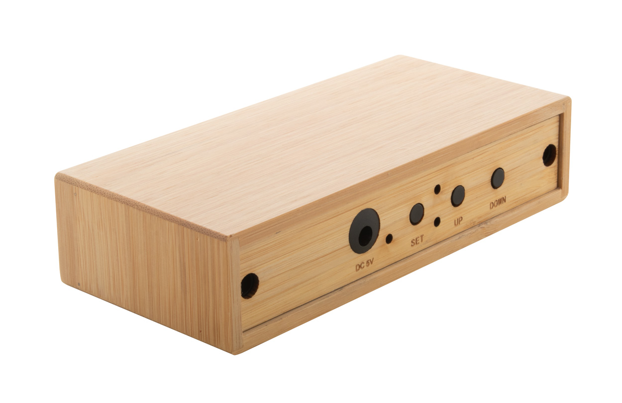 Multifunctional alarm clock in bamboo housing with LED display, thermometer and built-in wireless charger (10W). Including USB charger cable.
