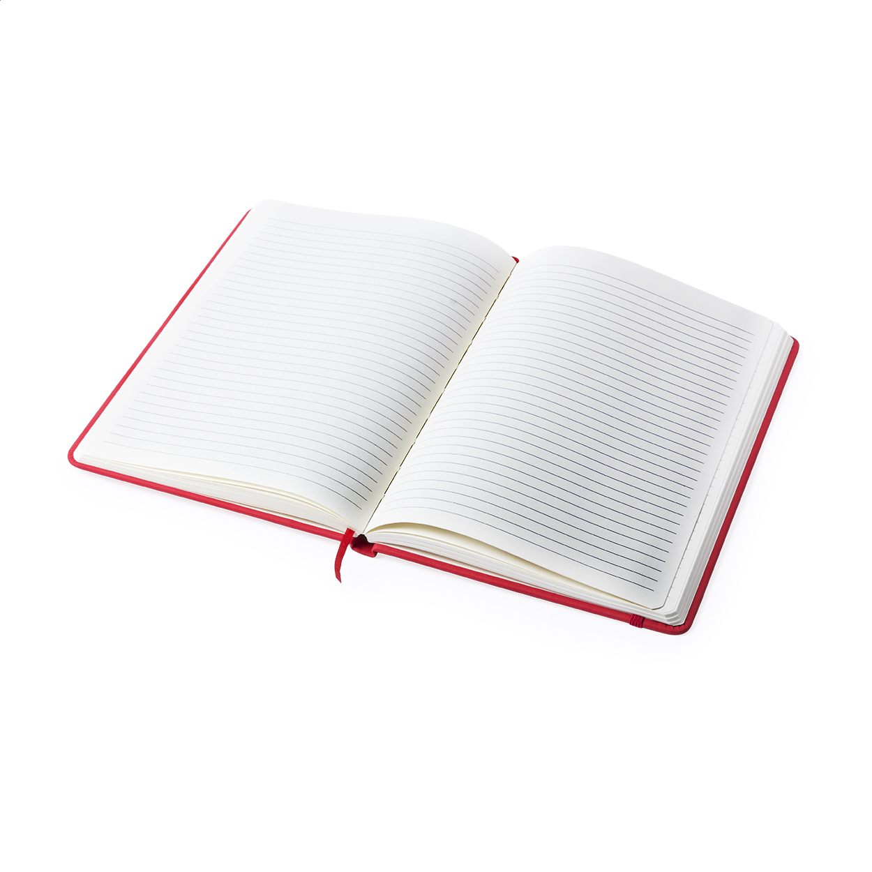 PU leather covered notebook with 100 lined sheets and rubber strap.