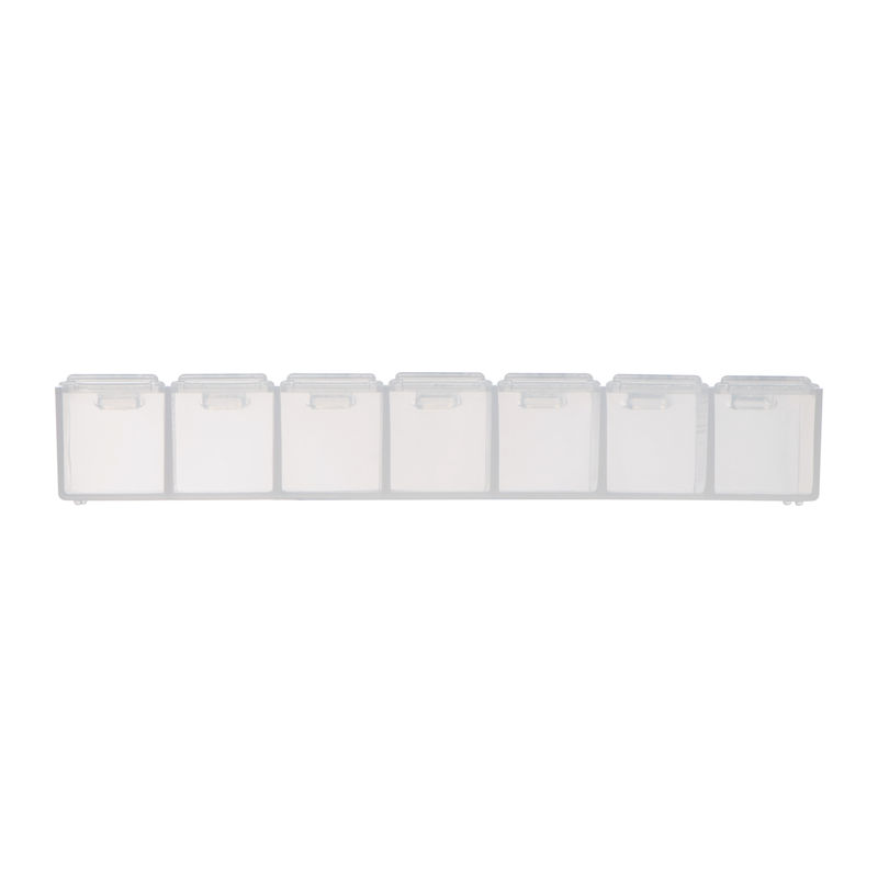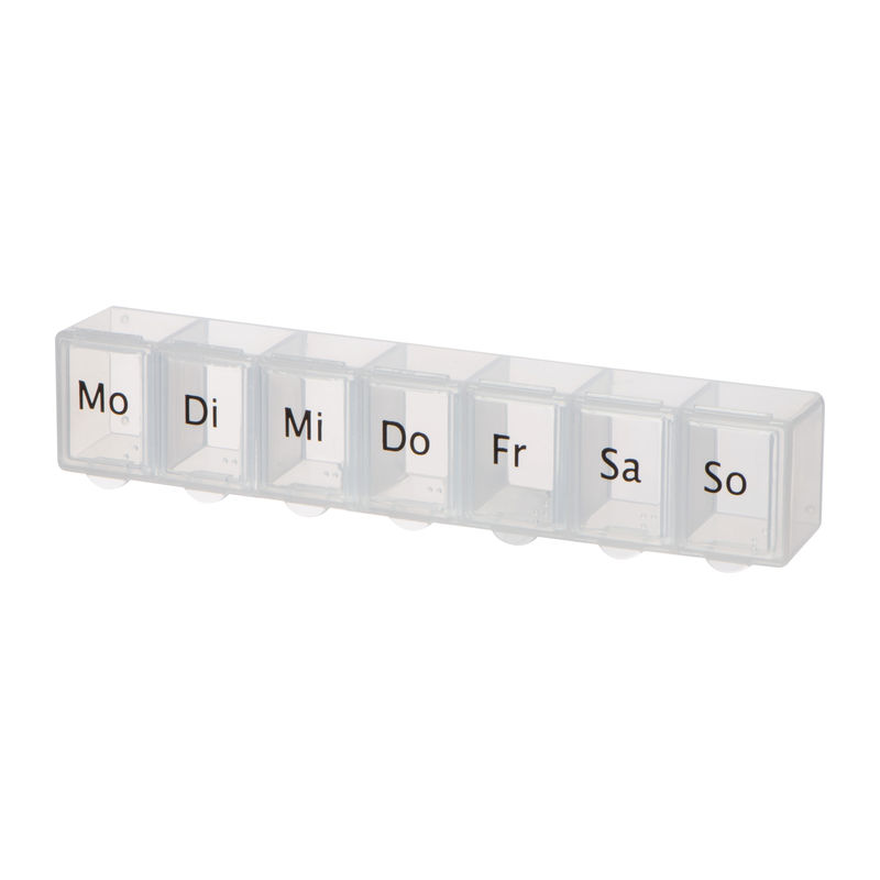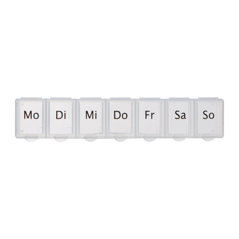 Plastic pill box with 7 compartments for the weekly storage of the required medication. The days of the week are also printed in Braille. We print your logo on one side.