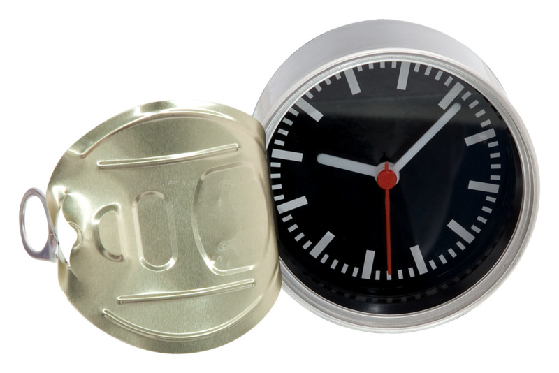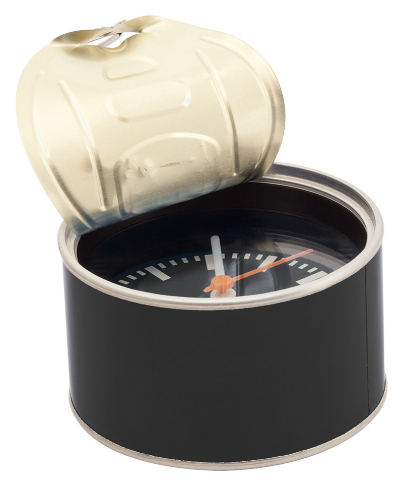 Tin can design analogue clock. Operates with 1 AA battery, without battery.