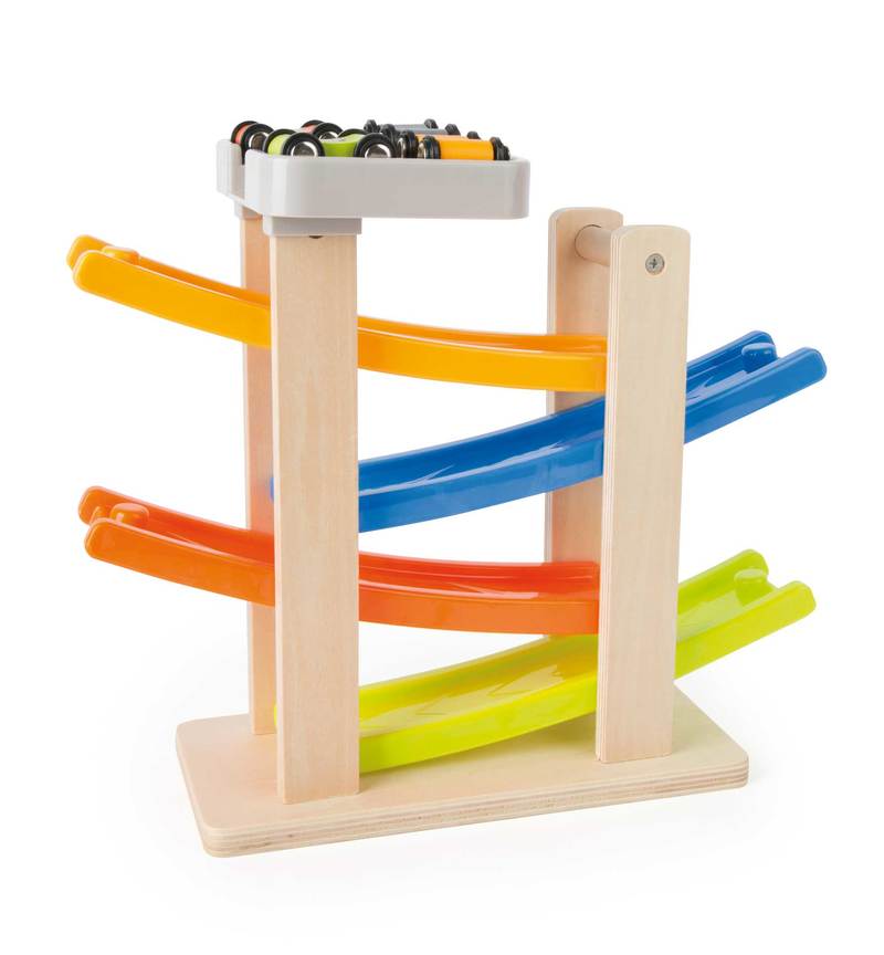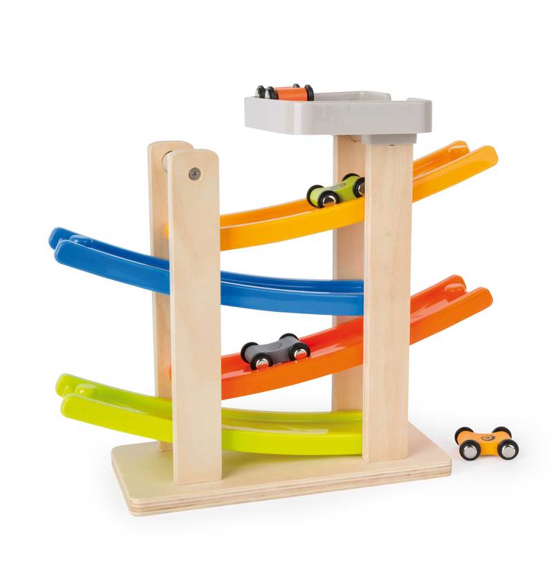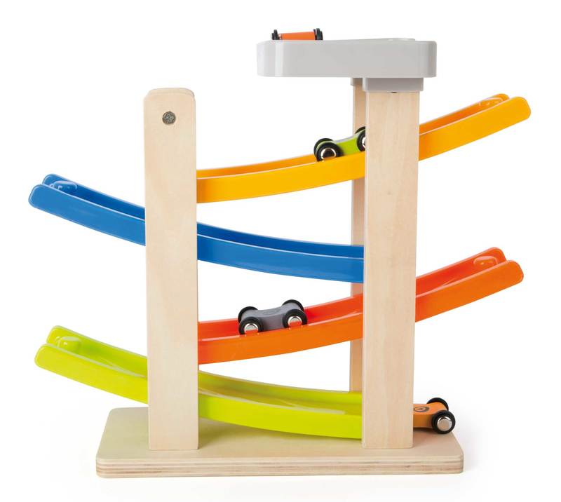 Now the race is really heating up! These wooden race cars streak down the ramps and perform breathtaking somersaults from level to level. This wooden racetrack has a stable base and is well-equipped for the children's room. Ready, set, go! This wooden race track has a stable base and is well-equipped for hard wear and tear in the children's room. On your marks, get set, go!