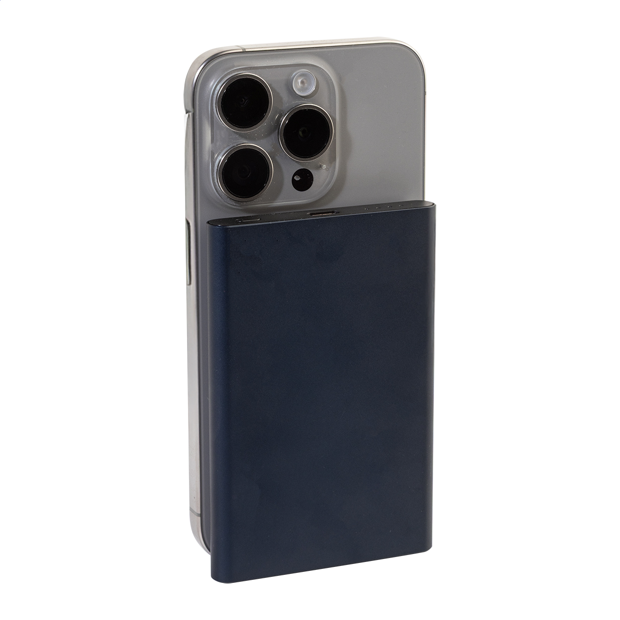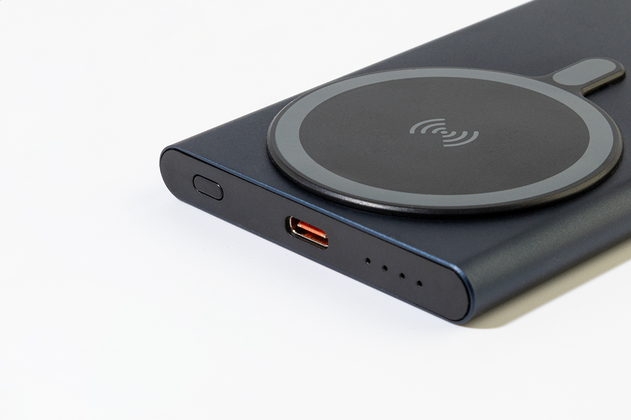 Recycled aluminium power bank with built-in magnetic wireless fast charger (15 W) and 5000 mAh battery. With USB-C input and charger port. Including self-adhesive metal ring to use the magnetic function on any wirelessly chargeable device. Compatible with iPhone® 12 or newer. Including USB charger cable.