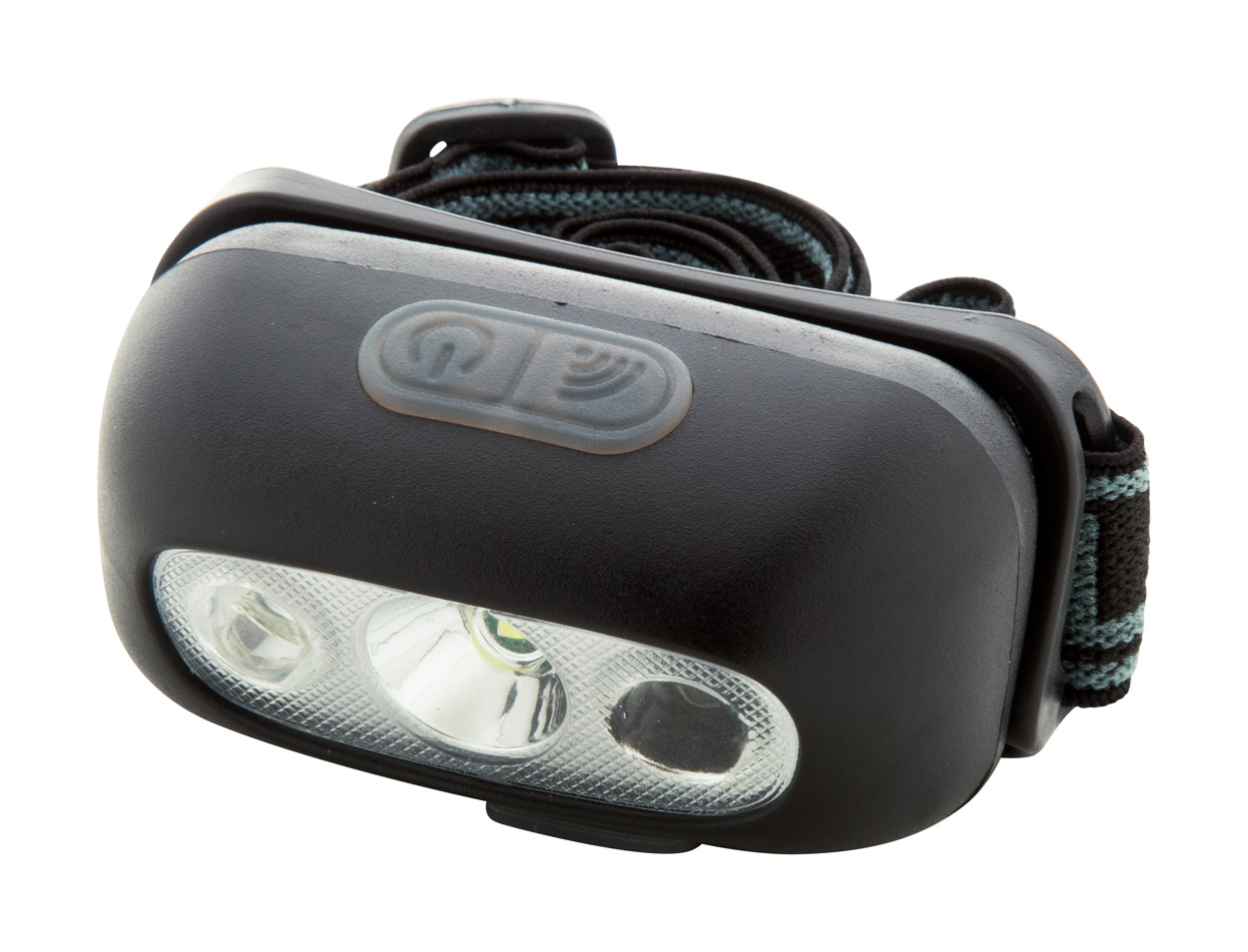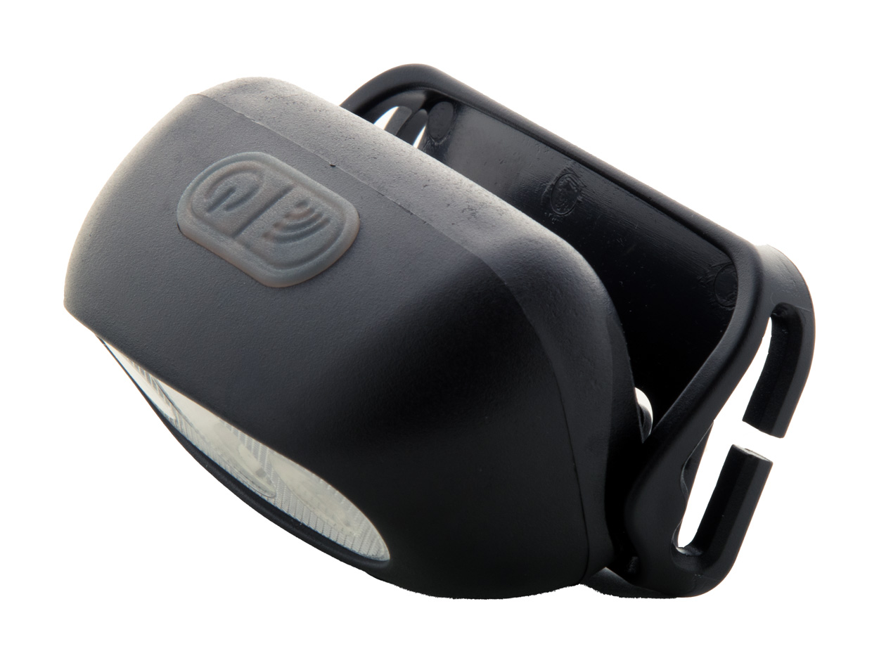 Plastic headlamp with with built-in USB rechargeable battery (400 mAh) and adjustable strap. With high power COB light and dual motion sensors. With high, low and motion sensitive light modes. Including USB charger cable.