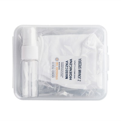 Set in box, 15 ml spray bottle for disinfectant, face mask with silver ions and place for filter, non-medical, reusable, made of 100% polyamide 250 g/m2, silver ions last up to 20 washes, washing temperature up to 90 degrees Celsius, mask made in Poland