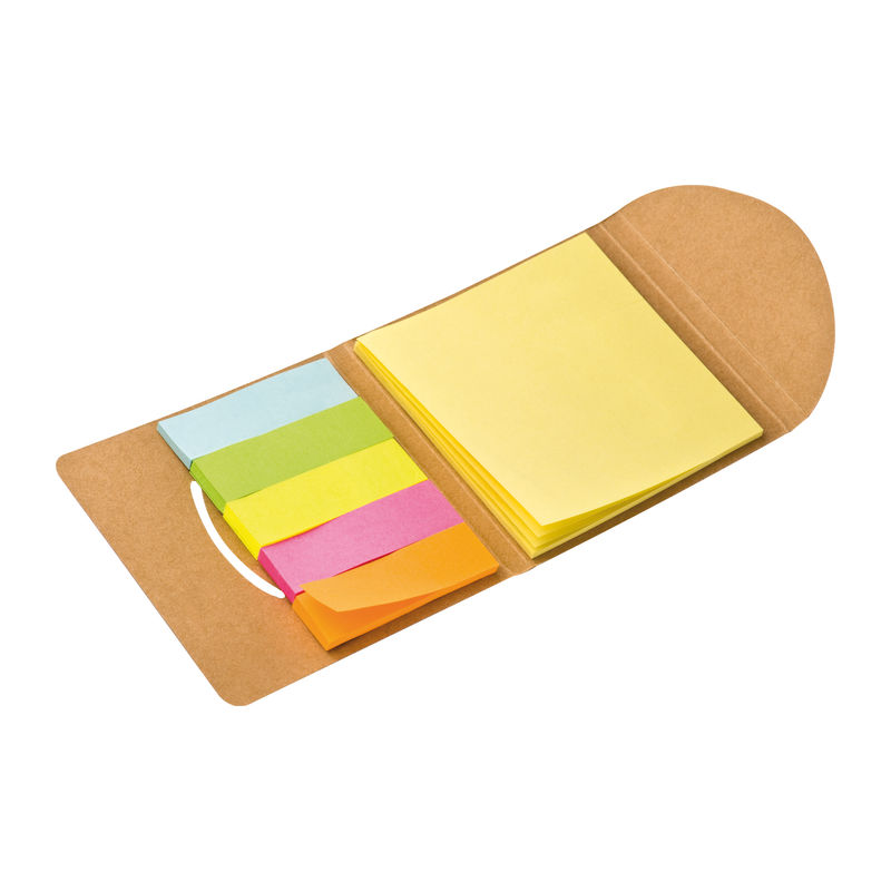 Practical sticky marker set in a natural look with coloured sticky markers (25 pieces per colour) and yellow sticky notes (25 pieces). We will print your logo on the cover.