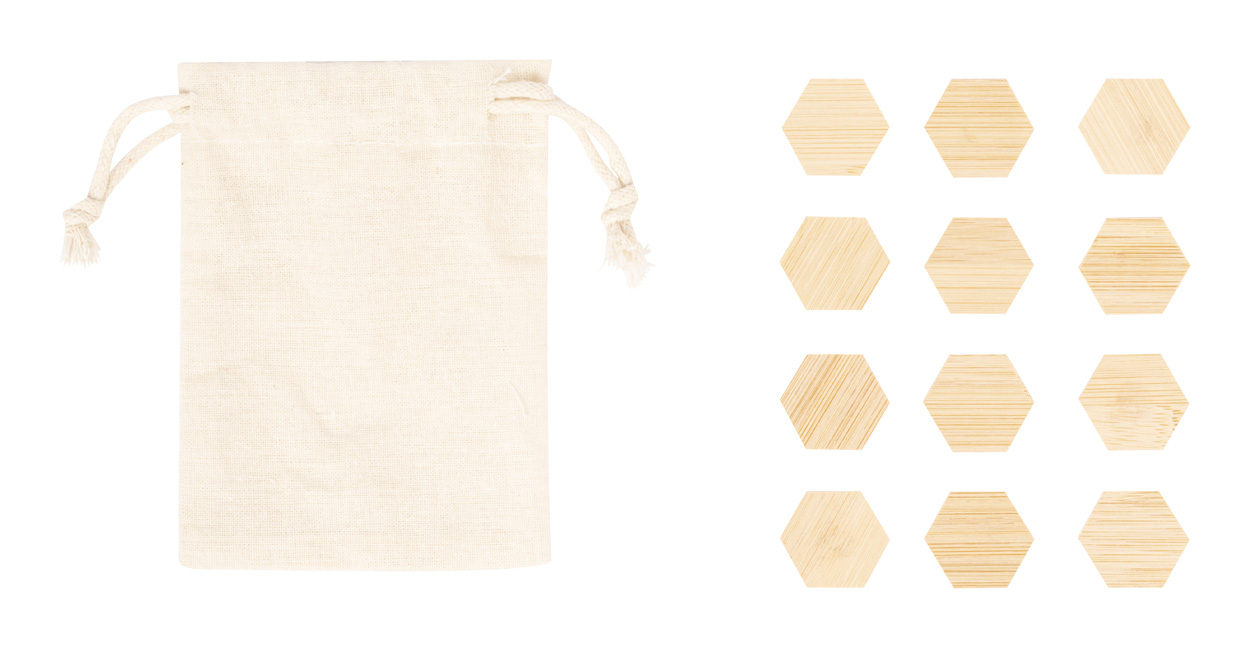 12 pc bamboo fridge magnet set, in cotton drawstring pouch.