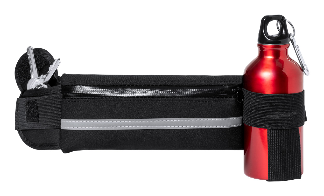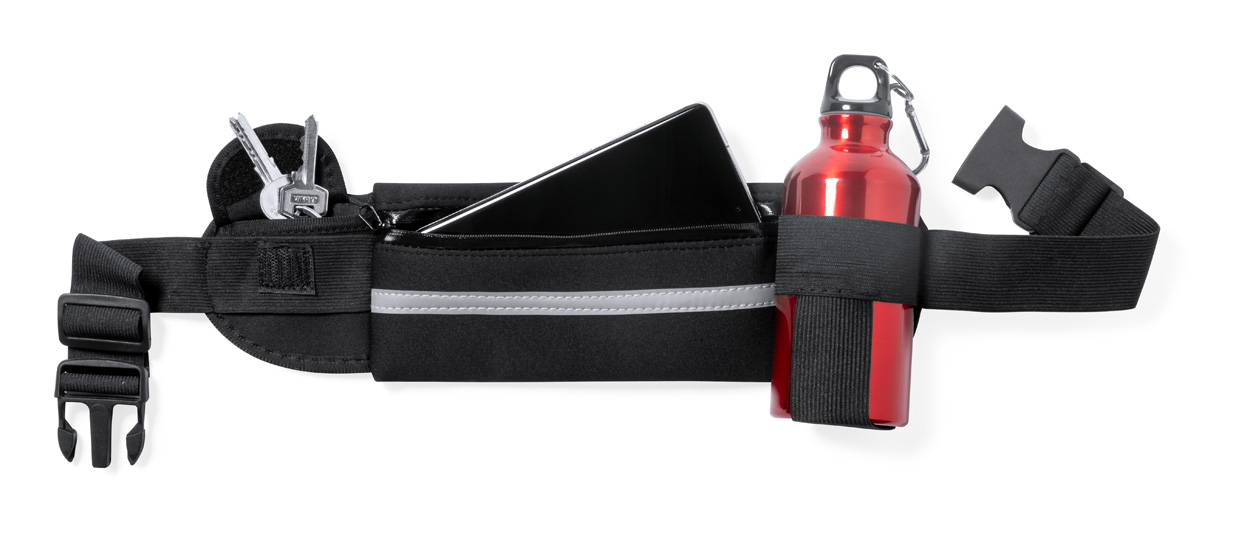 Waist bag in soft shell with 1 zipped compartment, 1 small pocket and elastic bottle holder, reflective band and adjustable strap. For promotional use only, the product does not qualify as a Personal Protective Equipment.
