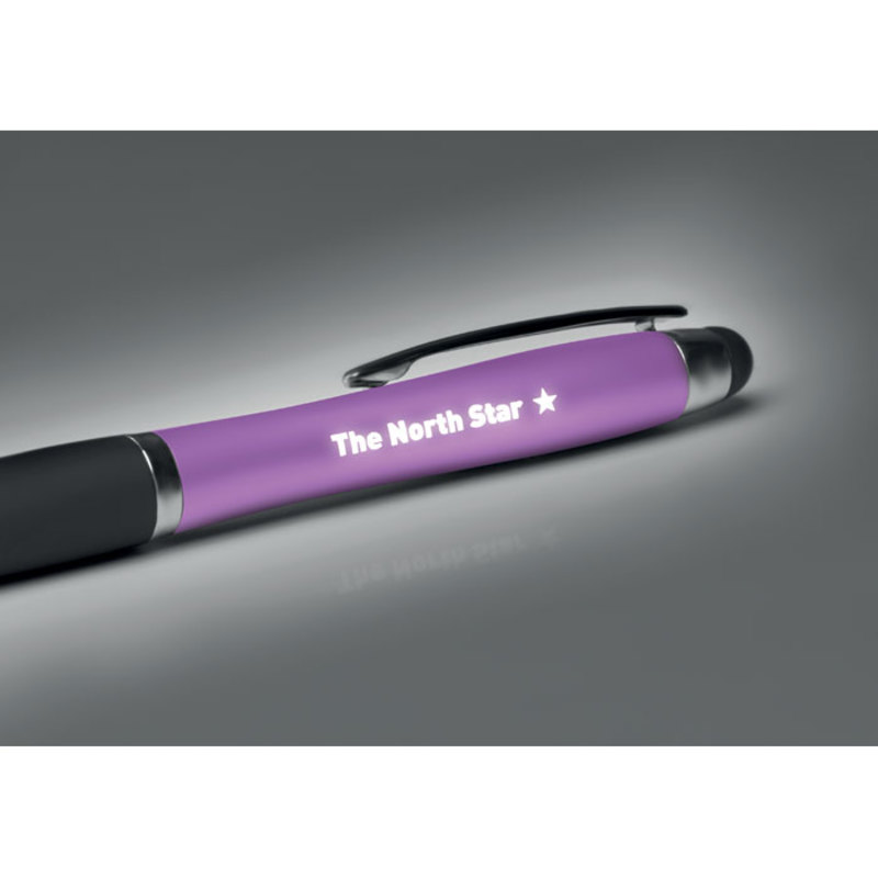 Twist action ball pen in ABS with stylus and soft grip. Blue ink. The barrel includes a light to illuminate the logo activated by pushing the stylus when an engraved logo is selected. The logo will not light up when pad print process is used. 3 AG3 cell batteries included.