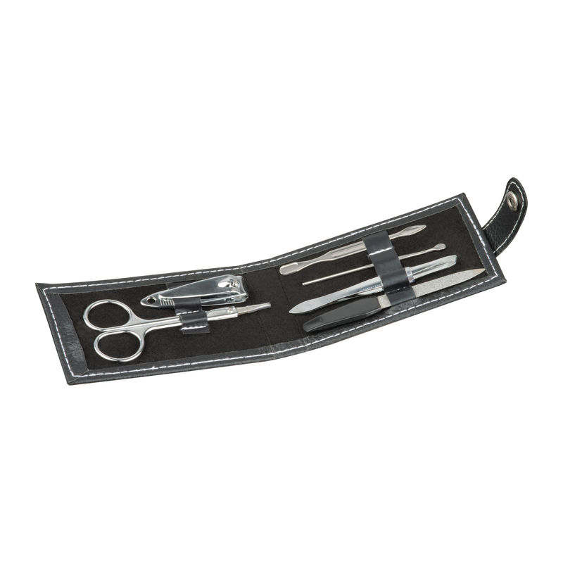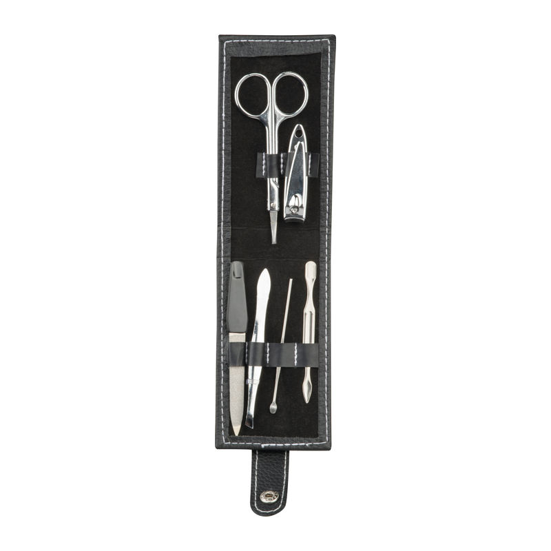 High-quality leather manicure case with stainless steel cutlery and diamond nail file, 7 pieces. Your logo will be printed on the front.