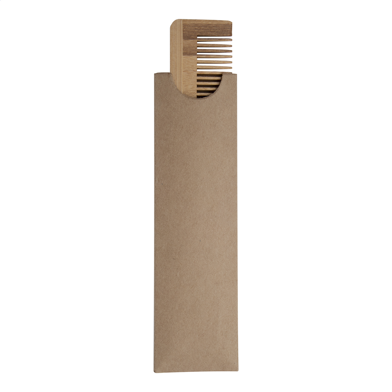 Bamboo comb in kraft paper sleeve.