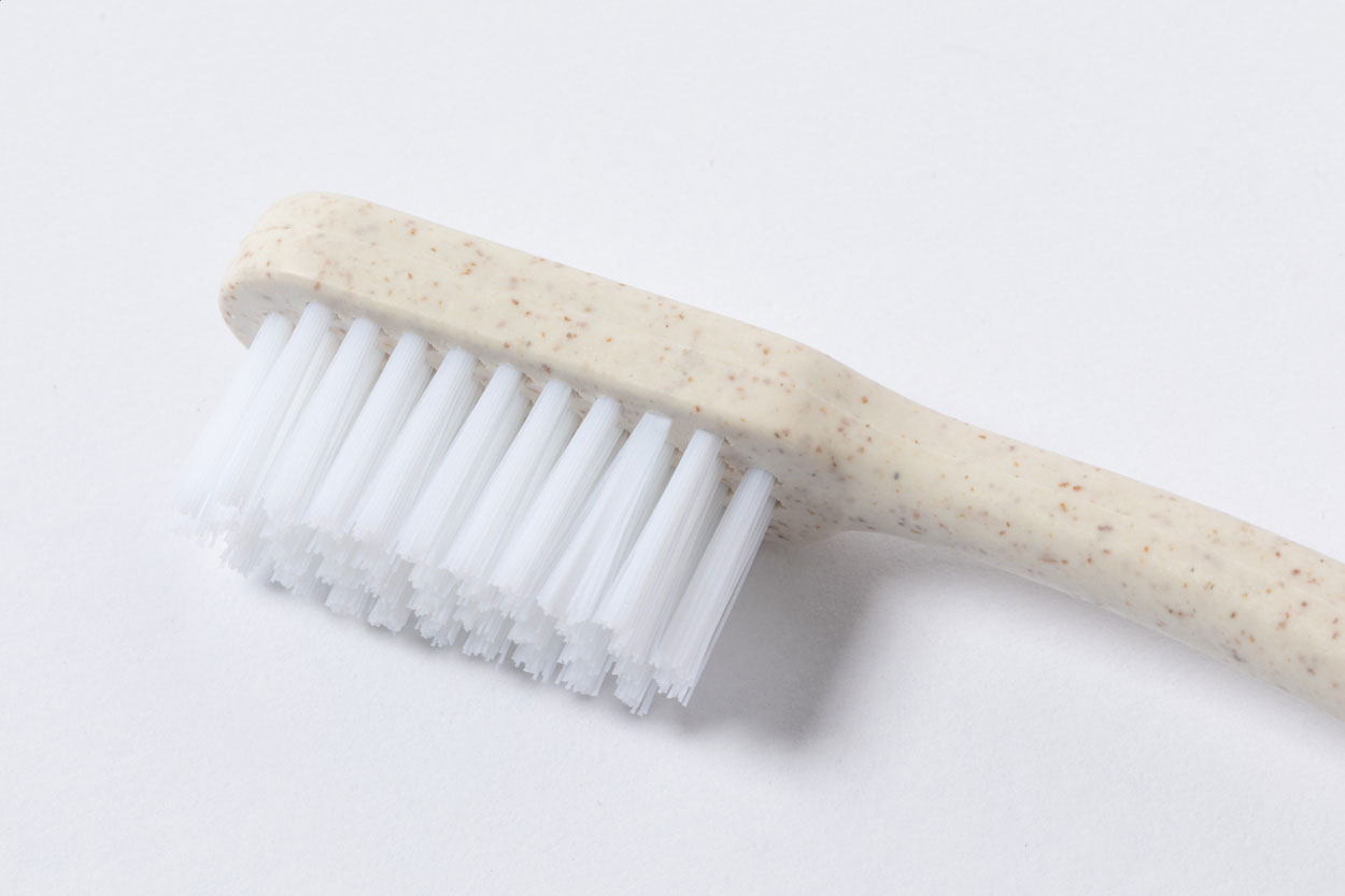 Foldable toothbrush in ecological wheat straw and PP plastic.