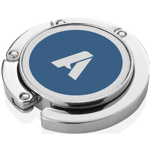 Foldable bag hanger which keeps a bag clean and safe. Hanger can be attached at the edge of a surface and can hold up to 4.5kg.