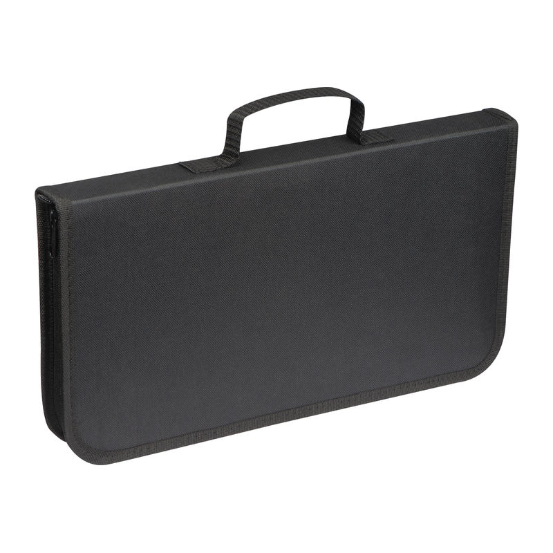 Barbecue set comprising a large wooden board, two knives with stainless steel blades, barbecue tongs, a meat fork, and a knife sharpener, all contained within a polyester case.