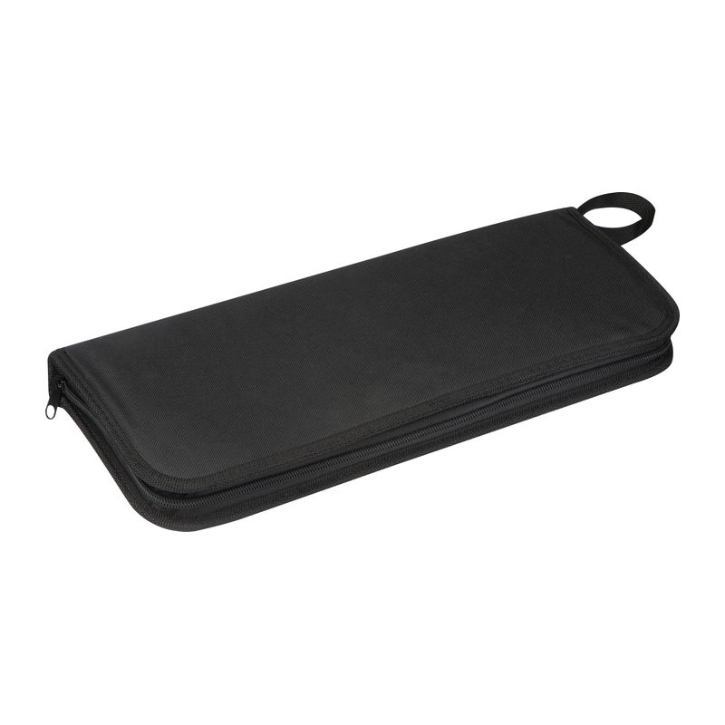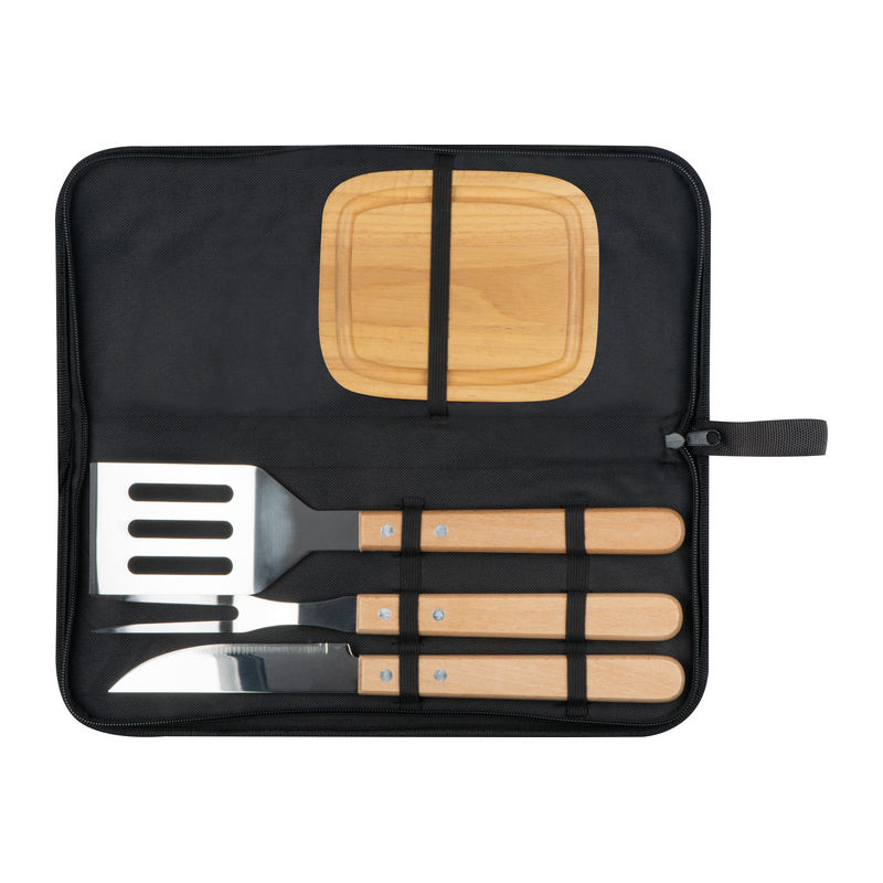 Barbeque set comprising a cutting board, barbecue turner, meat fork, and meat knife, all contained within a 600D polyester carrier bag with handles.