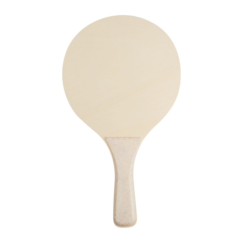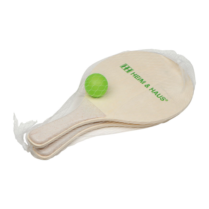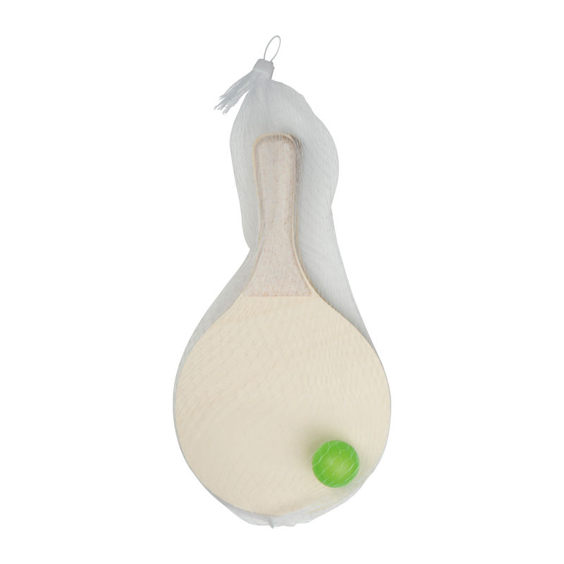 Beach ball set, packed in a net. The set includes two wooden rackets with plastic handle and one ball. Your logo will be printed on one racket.