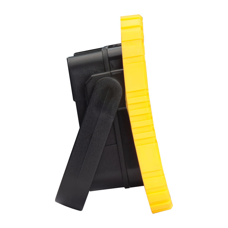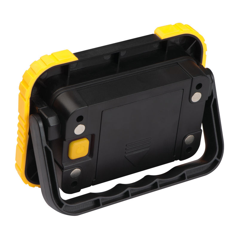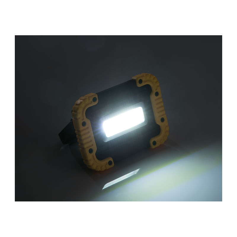 COB construction or work lamp made of plastic with 10 watts of power, 3 lighting functions (floor, SOS and flashing) and a fold-out handle for putting down or carrying. Your logo will be printed above the light.