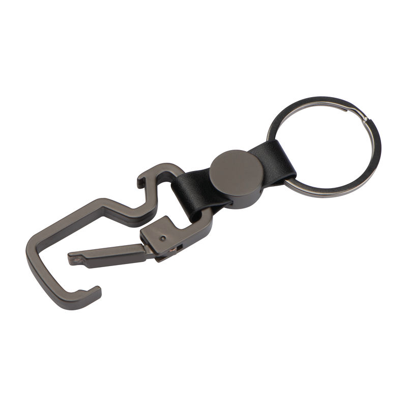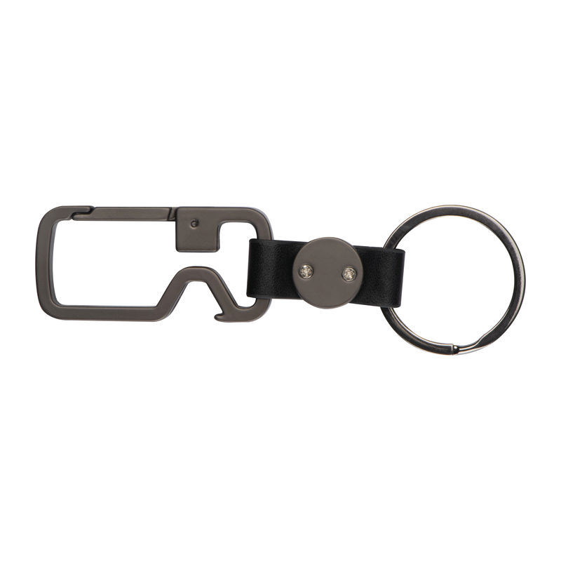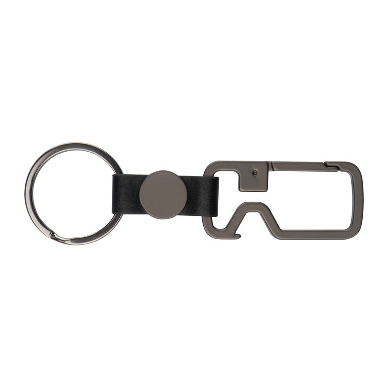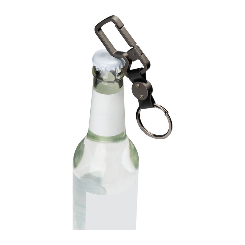 Graphite-coloured keyring featuring a carabiner, key ring, and integrated bottle opener.