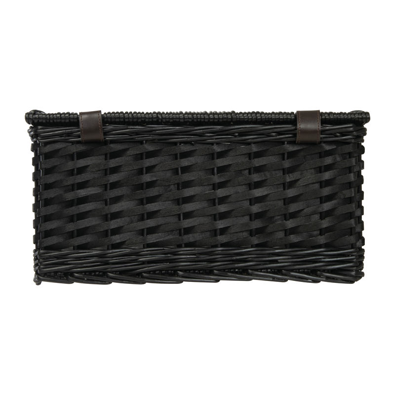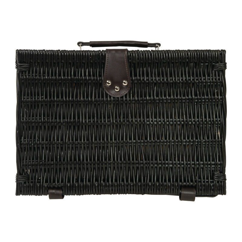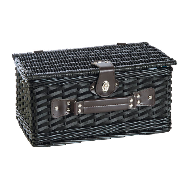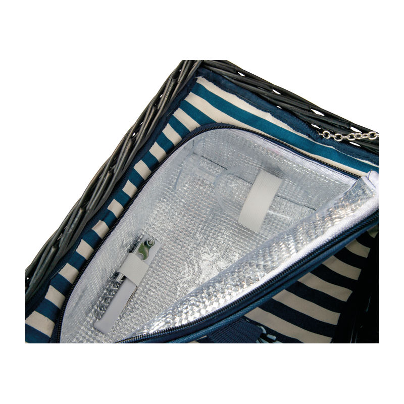 Spacious picnic basket for two, crafted from wicker, featuring an integrated cooler bag, ceramic plates, plastic jars, stainless steel cutlery, a waiter's knife, and salt and pepper shakers.