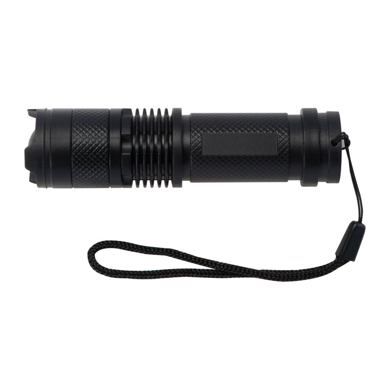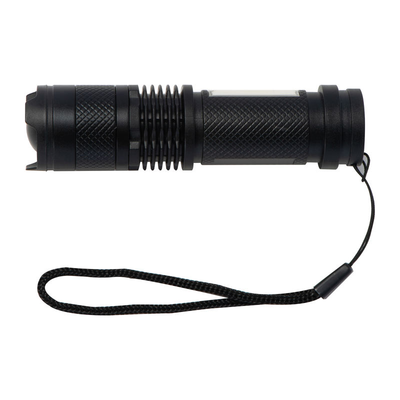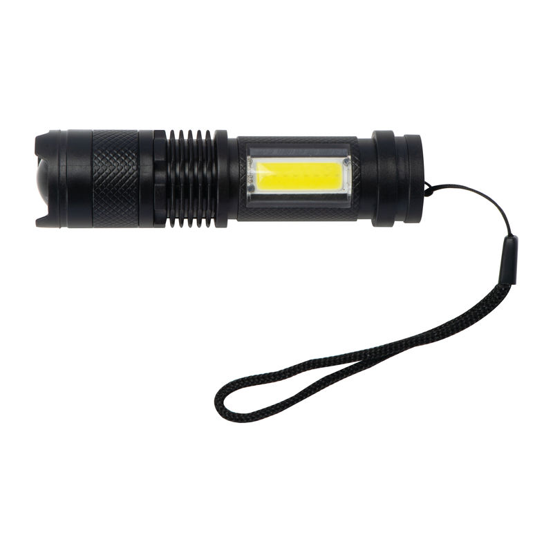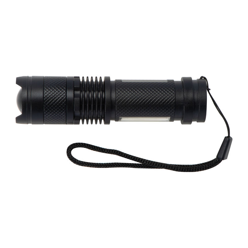 Rechargeable plastic COB flashlight with two different light modes (normal and flashing) as well as an adjustable focus and another lamp on the handle. Incl. charging cable (USB to USB-C port).