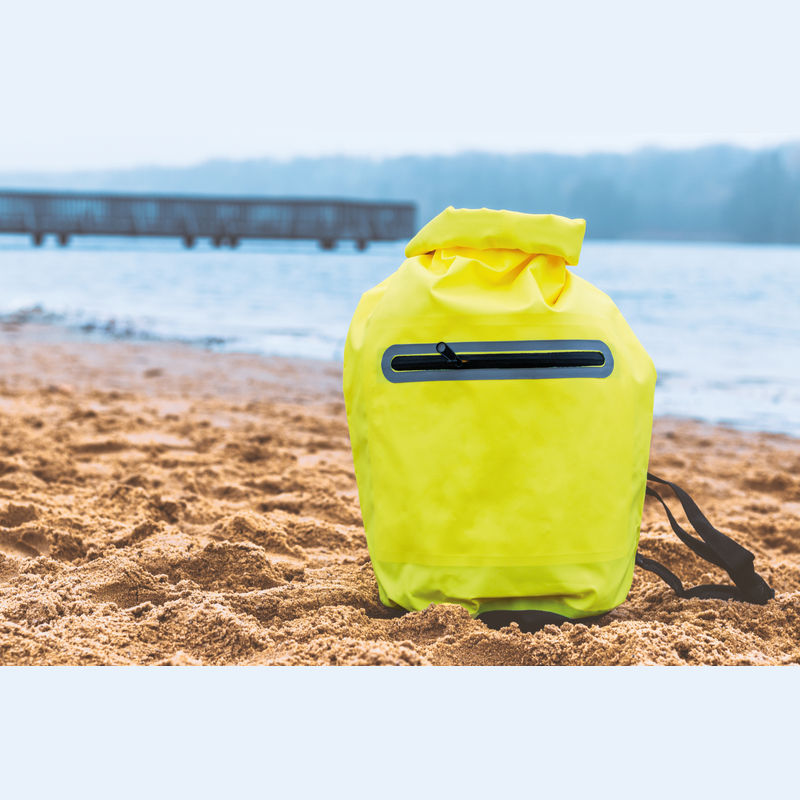 Neon-coloured, waterproof closable bag with shoulder / waist strap, reflective stripes on the front and a filling capacity of 15 liters. Your logo will be printed on the bag.