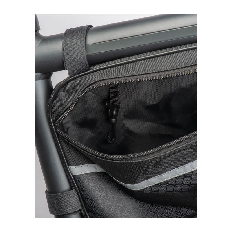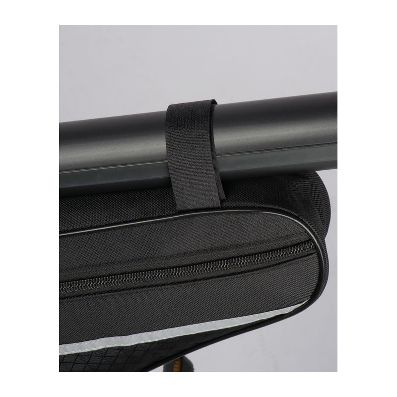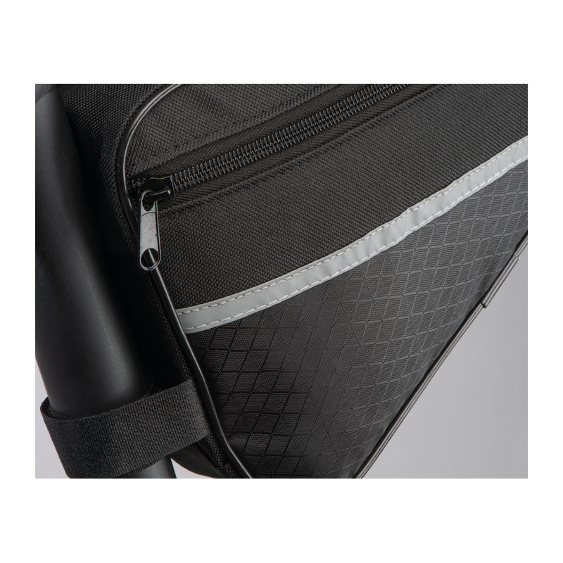 Bicycle bag crafted from durable 600D polyester featuring reflective stripes. Easily attached to the middle frame bar via brackets, it provides ample space for all essential items.