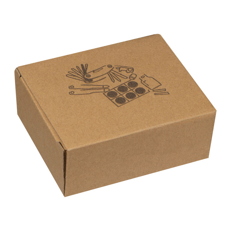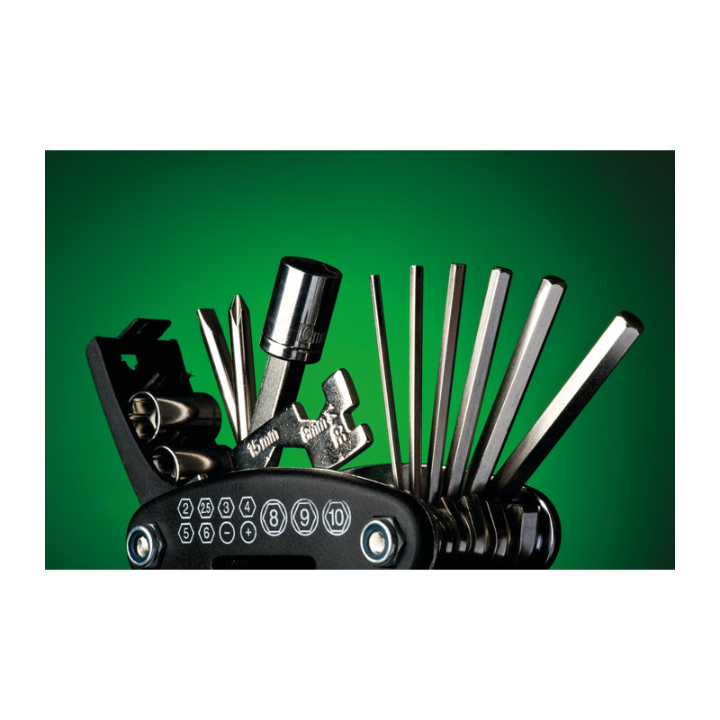 The complete bicycle repair kit, includes 17 pieces in a black bag. We will print your logo on the pouch.