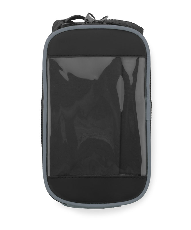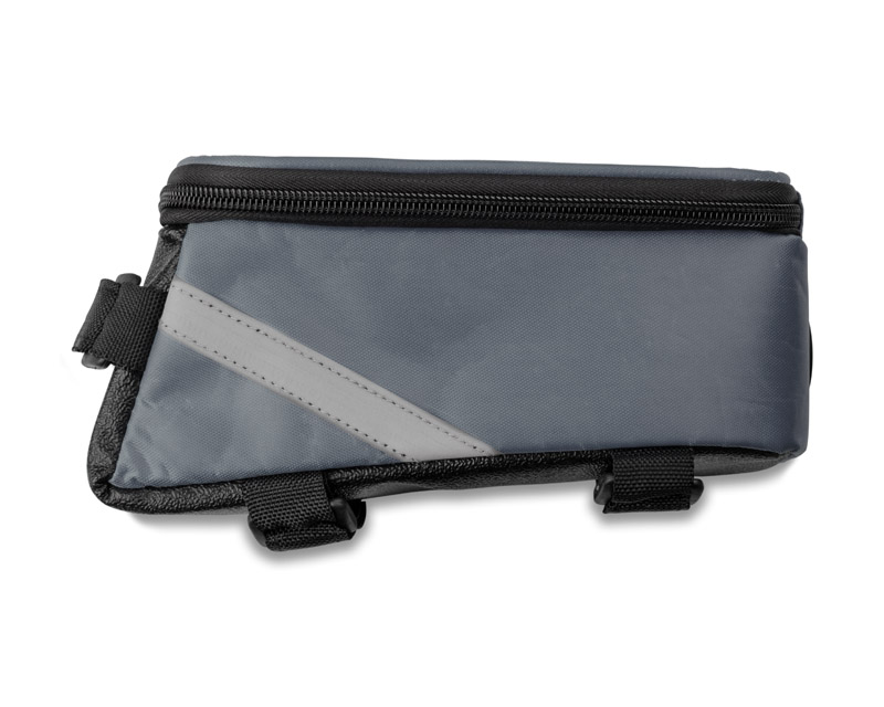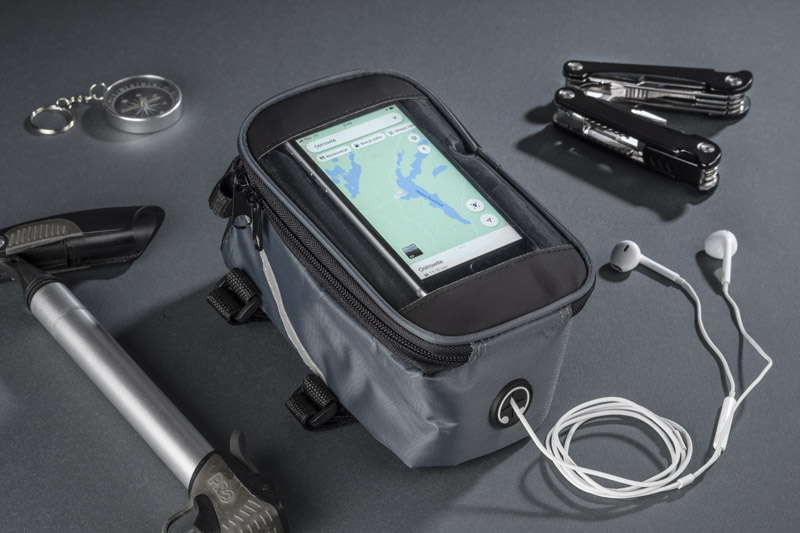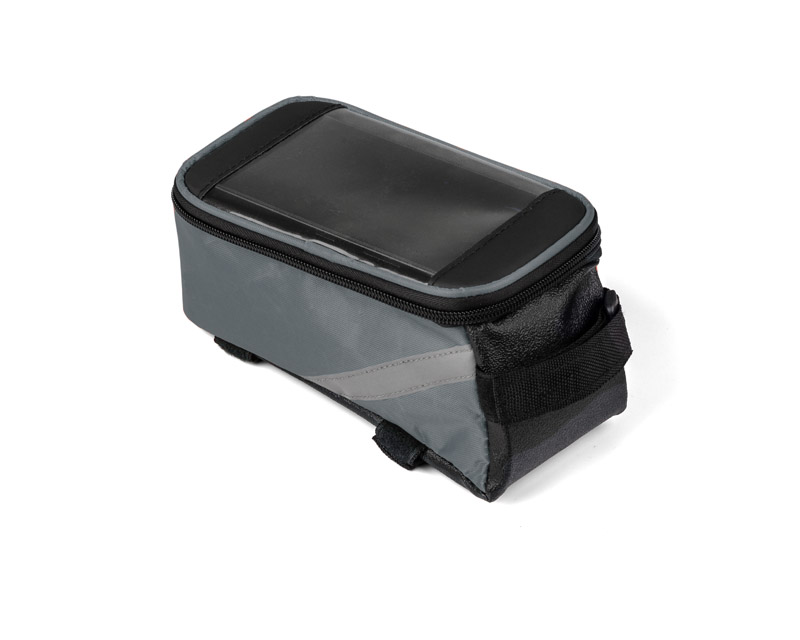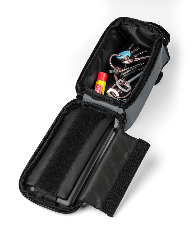 The bag solidly attaches to the bike frame and has a spacious zipped pocket for small items. In addition, VELO provides headphone access and a pocket with touch-sensitive film for your smartphone, which allows you to use it while it stays in the bag. Looking at the navigation or controlling the music player is not a problem anymore – even when cycling.