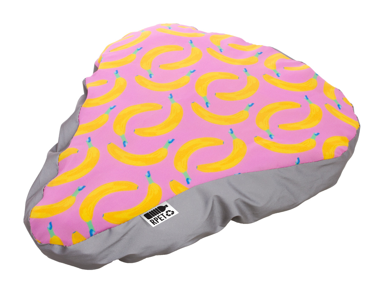 Custom made, full colour printed bicycle seat cover with reflective side and elastic band, 190T RPET polyester. With distinctive RPET label. Price includes sublimation printing. MOQ: 50 pcs. For promotional use only, the product does not qualify as a Personal Protective Equipment.