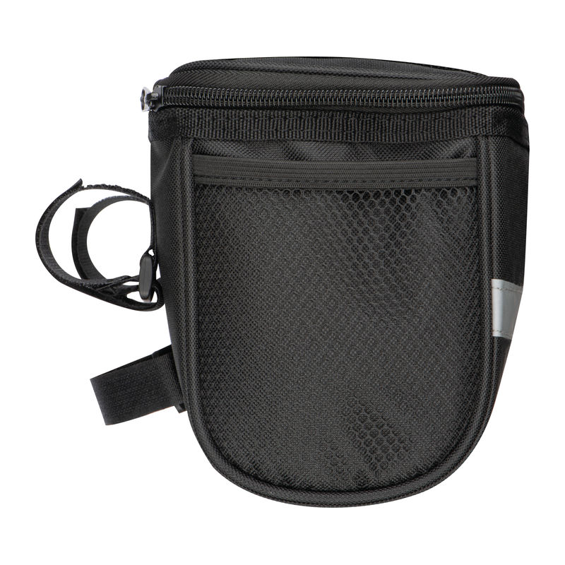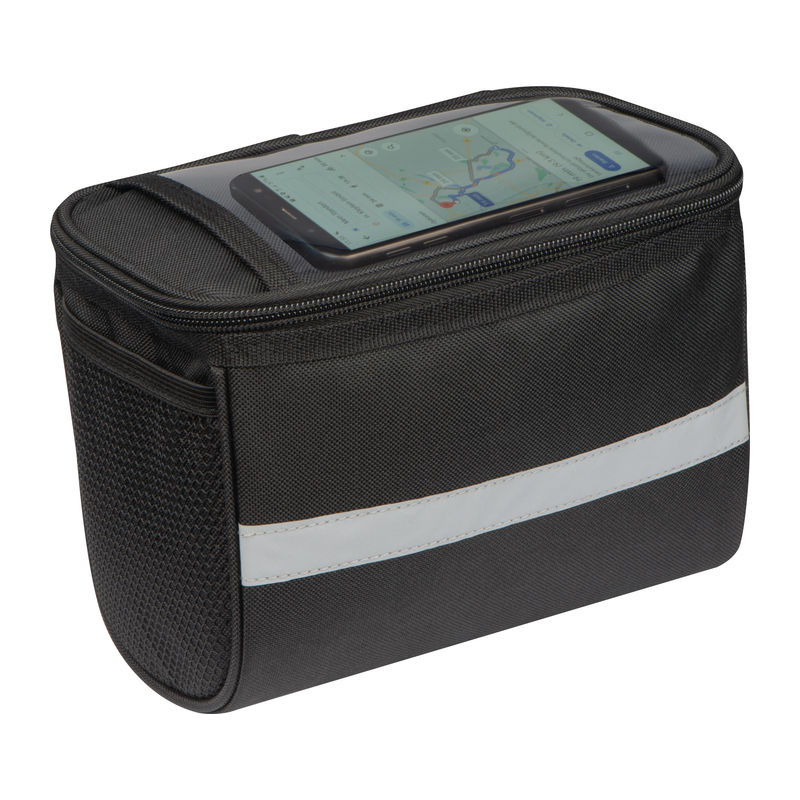Bicycle bag that is attached to the handlebars with a large main compartment, a compartment for smartphones that also interacts via touch when it is under the film. A reflective strip on the front also draws attention to you. Your logo will be printed on the bag.