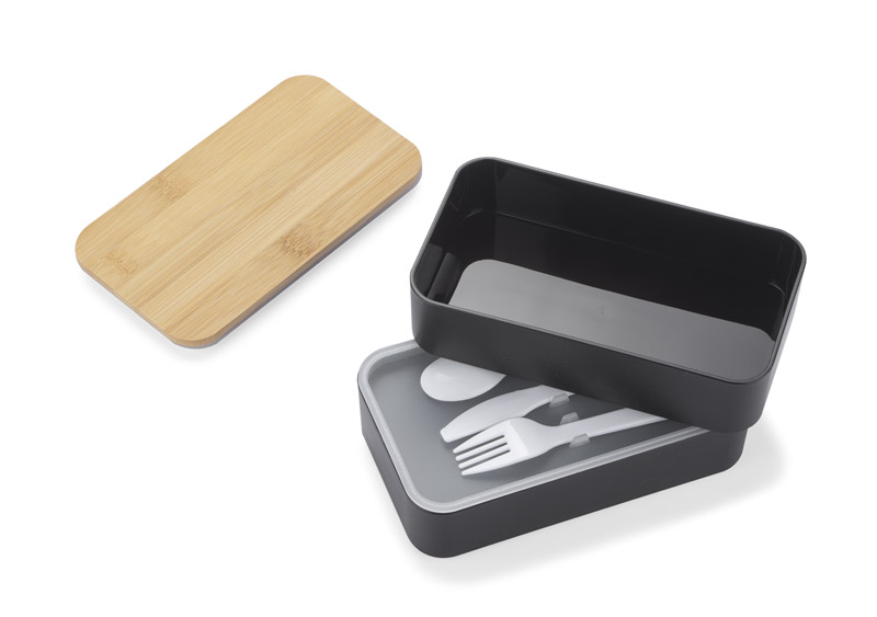 The COUPLE food container is made of plastic, has a bamboo lid and an elastic band to prevent accidental opening. The container consists of two interconnected chambers, placed one below the other, separated by a lid. The container can be used in a dishwasher, microwave oven and freezer.