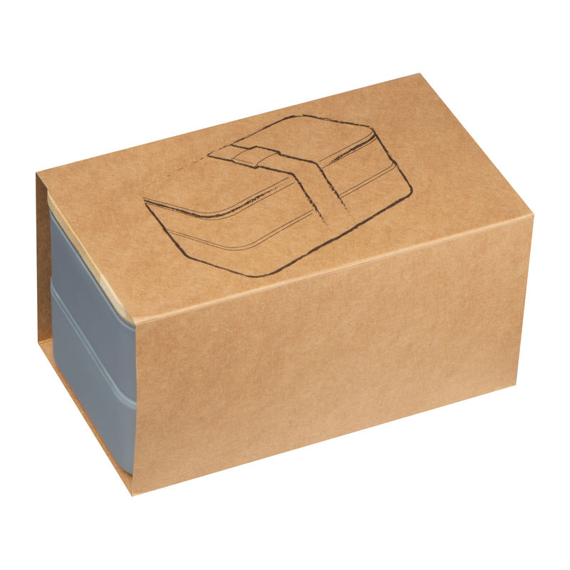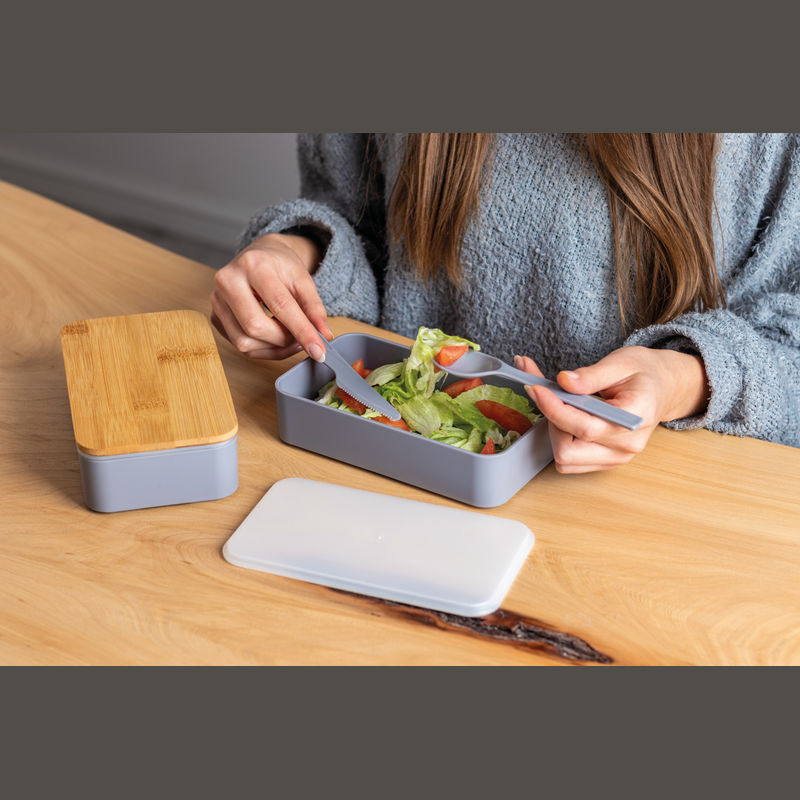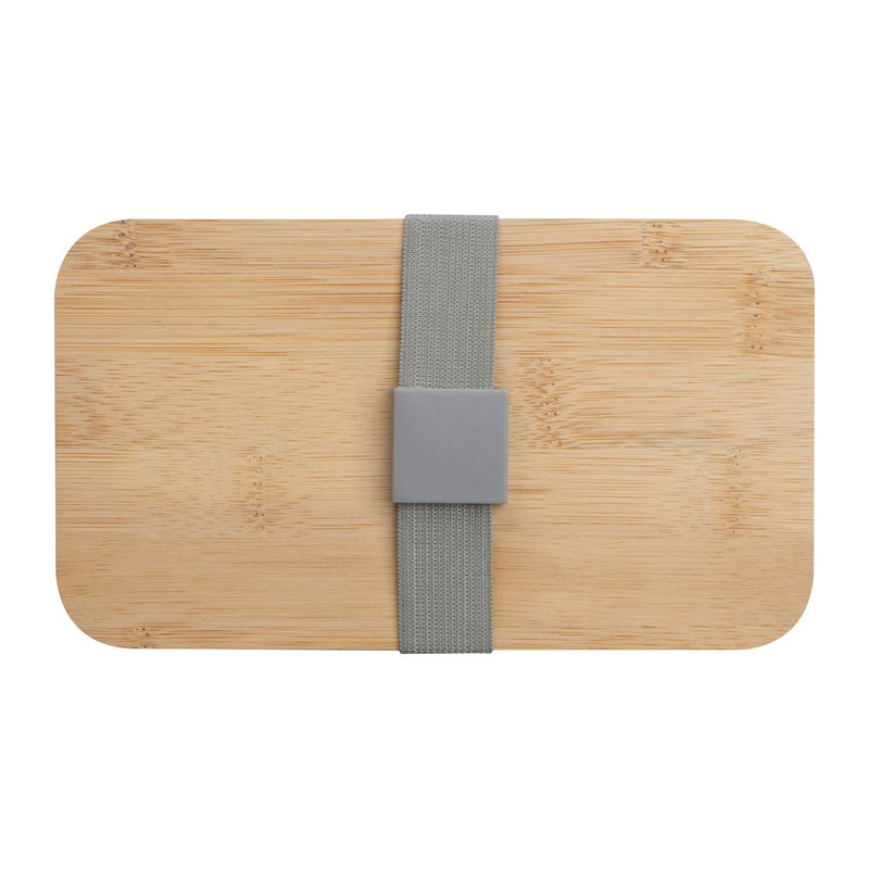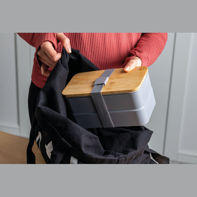 Two-tier lunch box with two separate compartments (both with their own lid), bamboo lid, a separator, knife, fork and a rubber band to close. Your logo will be engraved onto the bamboo lid.