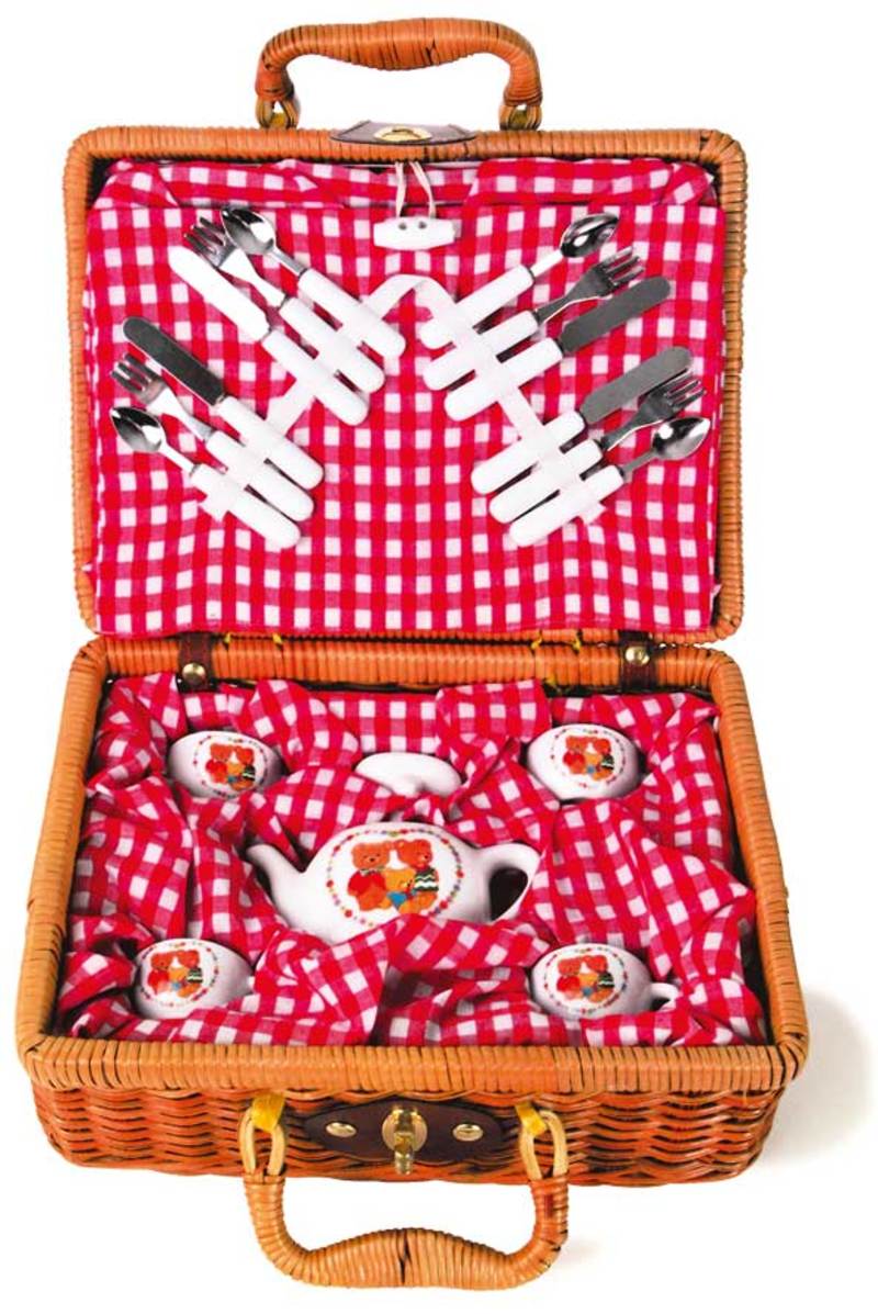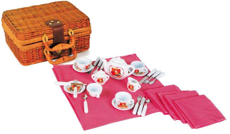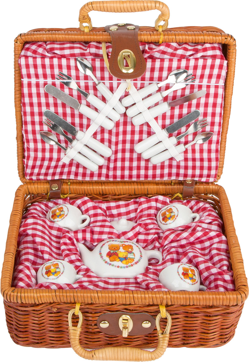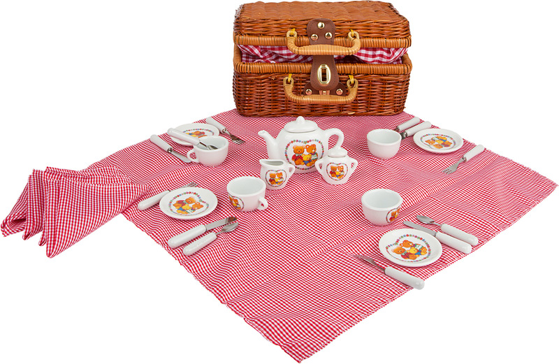 Come on, let's go for a ride! This cute braided picnic basket with porcelain tableware invites you to a wonderful picnic time. This complete game set contains 31 pieces, including tablecloth and napkins. The red and white chequered pattern gives the picnic basket a classic design. Playing with this cute basket encourages active role-playing. After playing, all parts can be safely stowed away in the basket. Thus, it is also ideal for on the go!