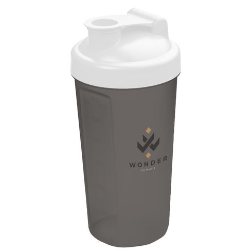 Functional, transparent plastic shake cup for mixing protein drinks. With indication of the contents (per 50 ml). The screw cap is equipped with a lockable opening. Content 600 ml. Food Approved. Made in Germany.