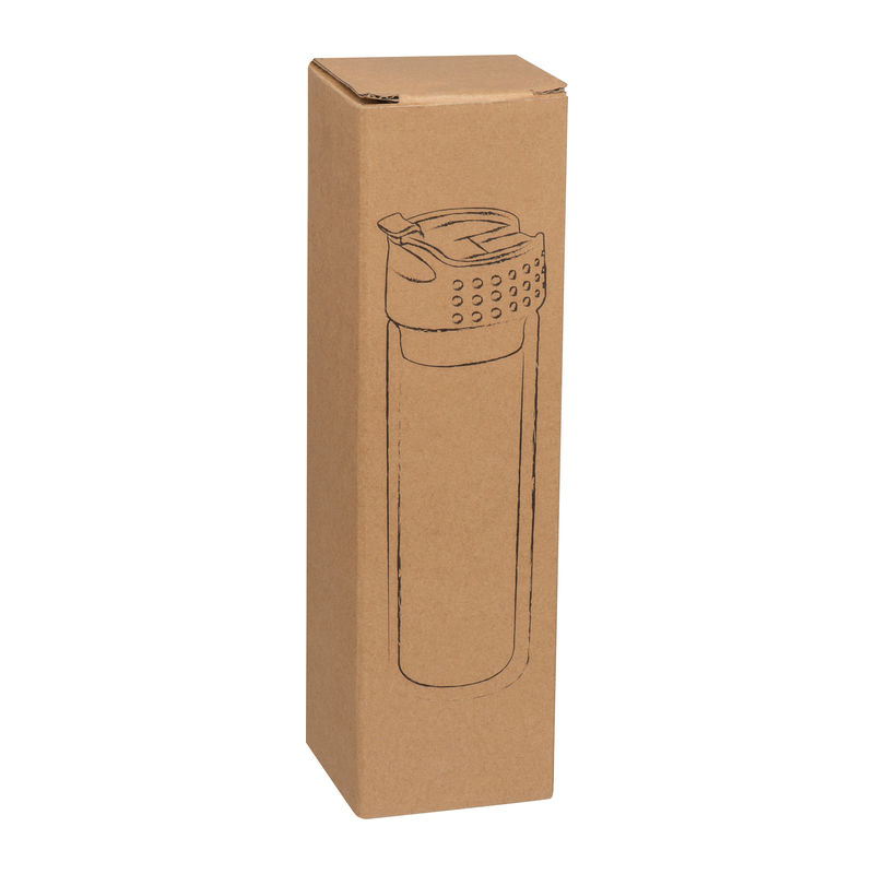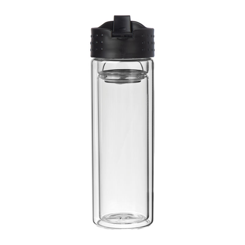Double-walled glass bottle with sieve and 400 ml capacity. Your logo will be printed via ceramic transfer on the glass.