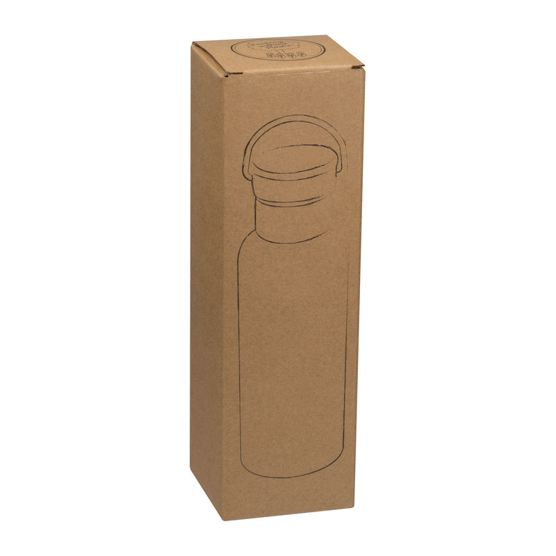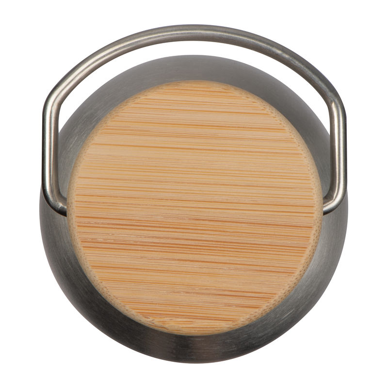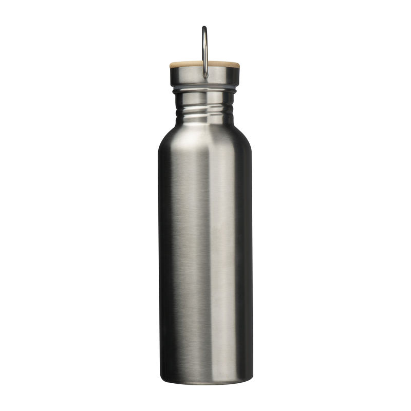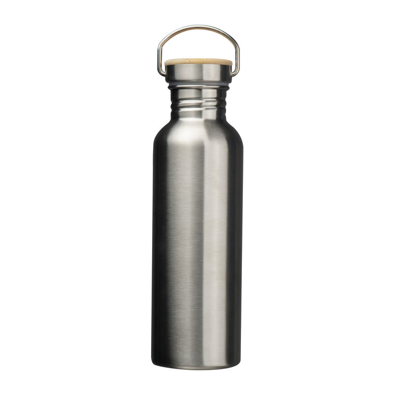 Stainless steel drinking bottle with a leak-proof bamboo lid, carrying strap, and an 800 ml capacity.