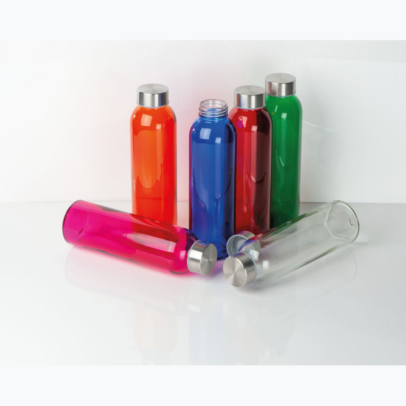 Stylish glass drinking bottle available in various colours, featuring a 500 ml capacity and a stainless steel cap.