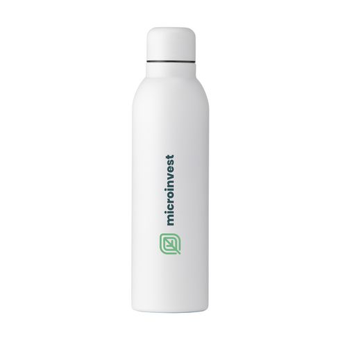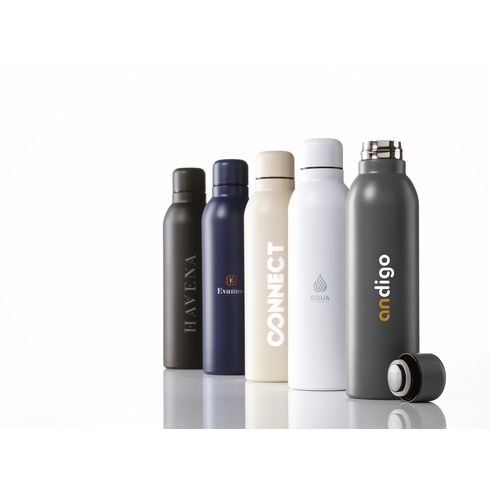 Double-walled water bottle/thermos bottle made from recycled stainless steel. Vacuum-insulated, leakproof and finished with a beautiful powder coating. Suitable for keeping cold or hot drinks at the correct temperature. RCS-certified. Total recycled material: 90%. Capacity 500 ml. Stainless steel can be recycled many times whilst retaining the quality of the material. By using recycled stainless steel, fewer new raw materials are needed. This means less energy consumption and less use of water. Packed individually.