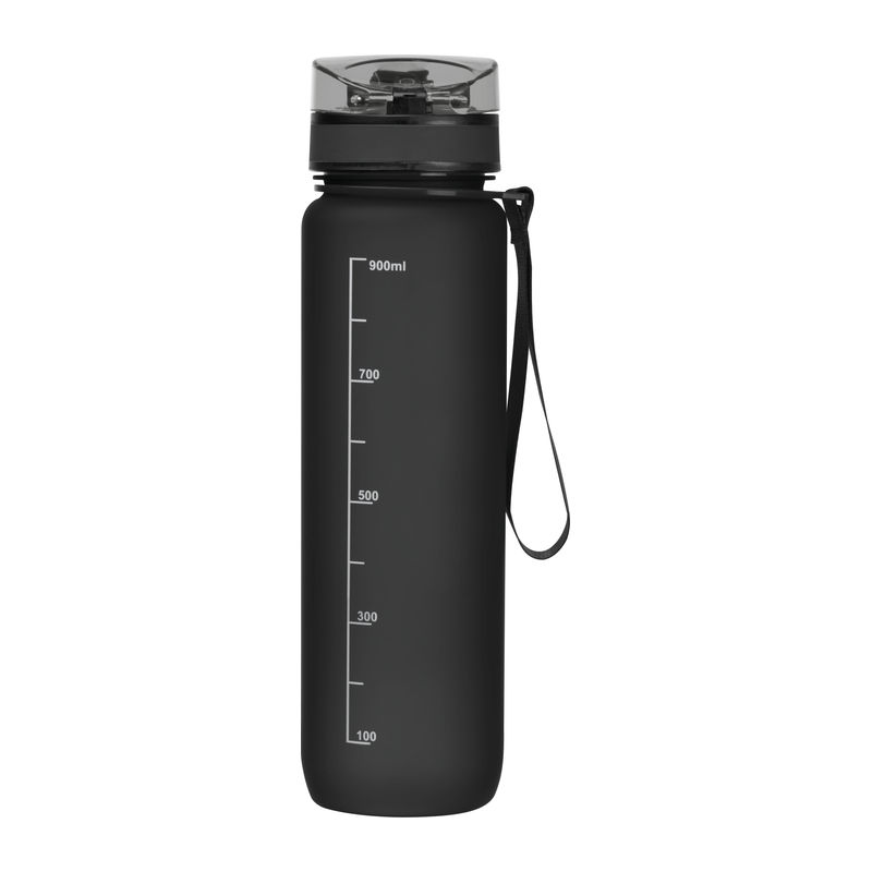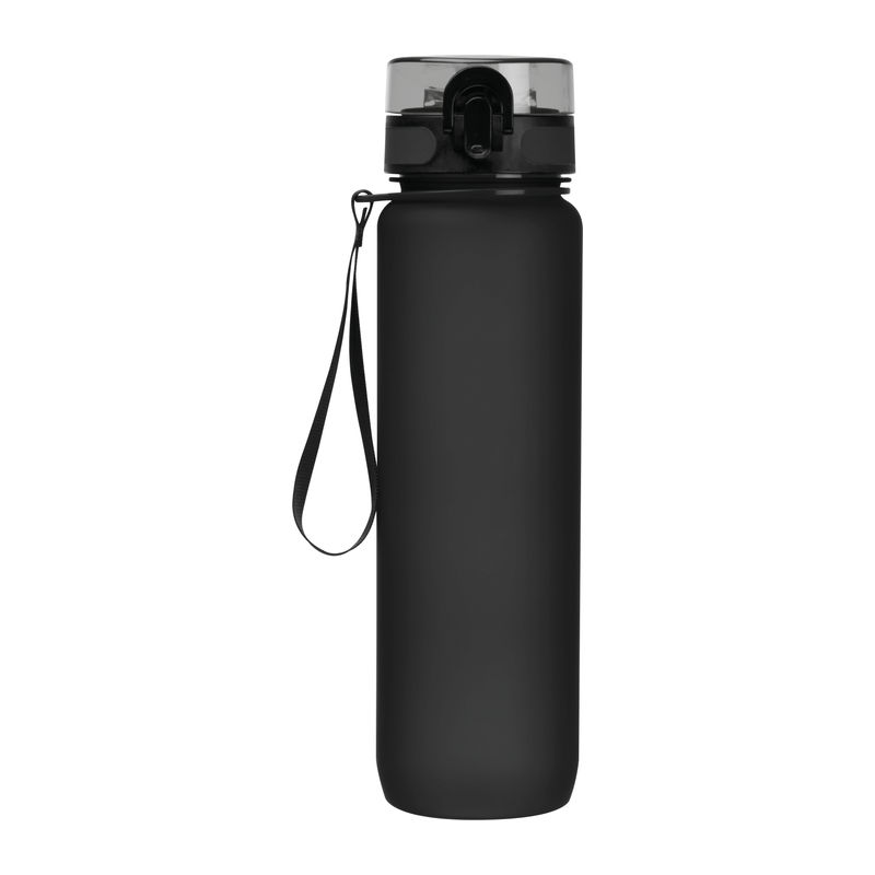 Leak-proof, BPA-free drinking bottle made of Tritan with lockable lid, drinking device and hand strap. The bottle has a filling capacity of 1,000ml with printed scale. Your logo will be printed on the bottle.