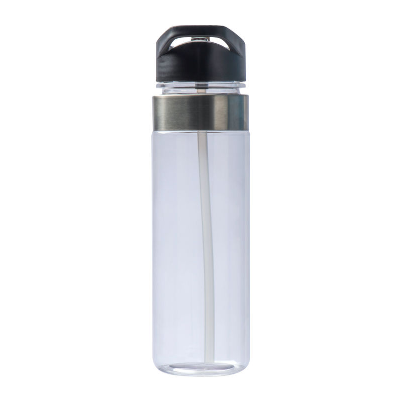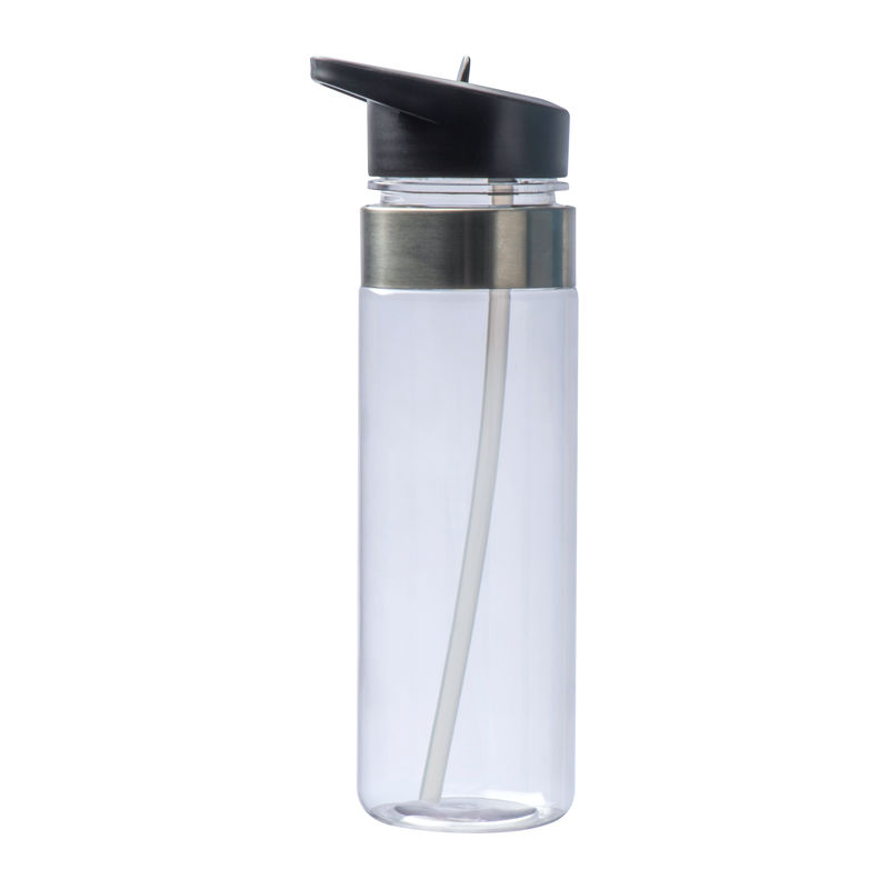 Sports bottle with a 700 ml capacity, crafted from recycled PET. Features include a straw, a foldable drinking spout, and a stainless steel ring.