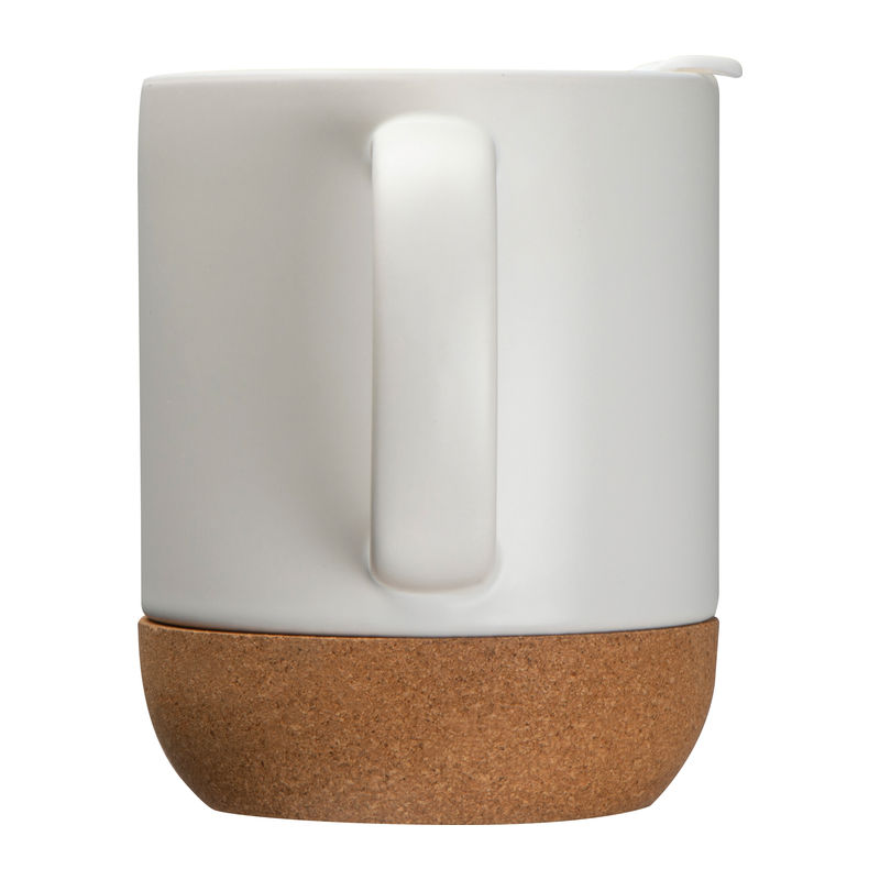 Sublimation mug featuring a lid and a removable cork base, with a capacity of 300 ml. Each unit is individually packaged in a cardboard box.