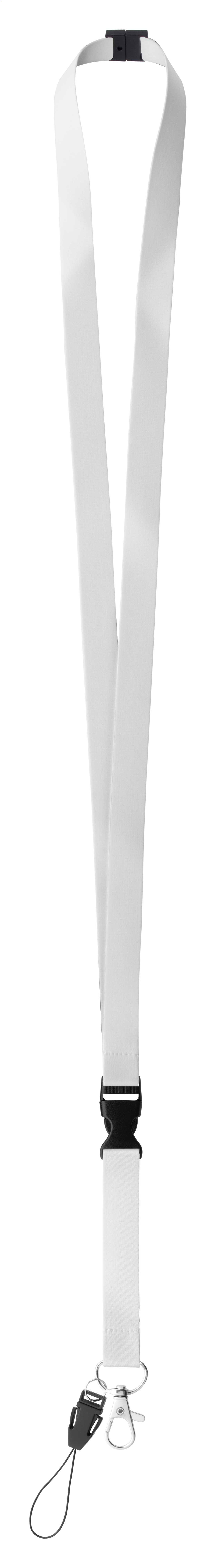 Custom made, 15 mm wide polyester lanyard with detachable metal carabiner, mobile string and safety buckle. With sublimation printed graphics on both sides. MOQ: 100 pcs.