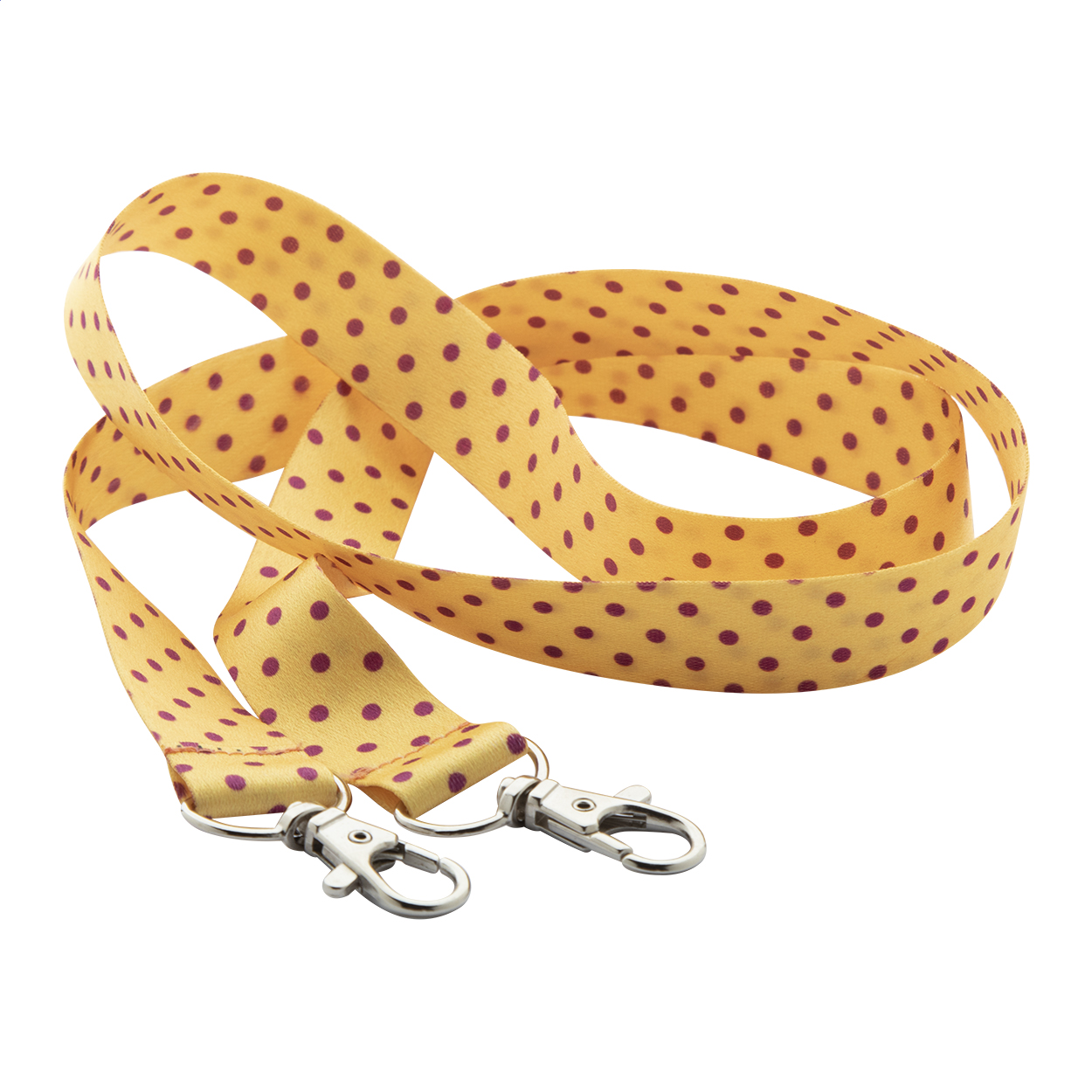 Custom made, RPET lanyard with 2 metal carabiners. With sublimation printed graphics on both sides. MOQ: 100 pcs.