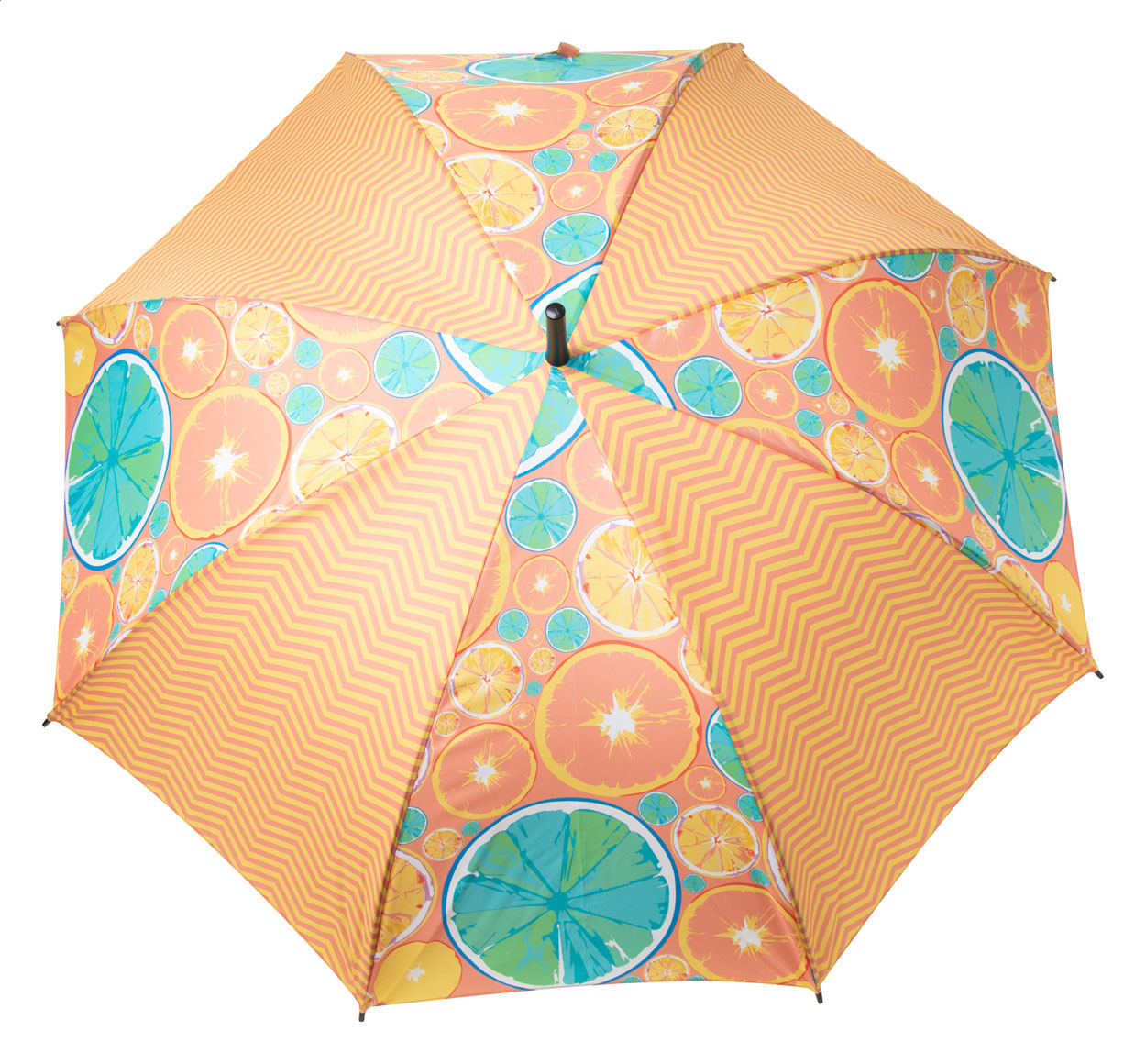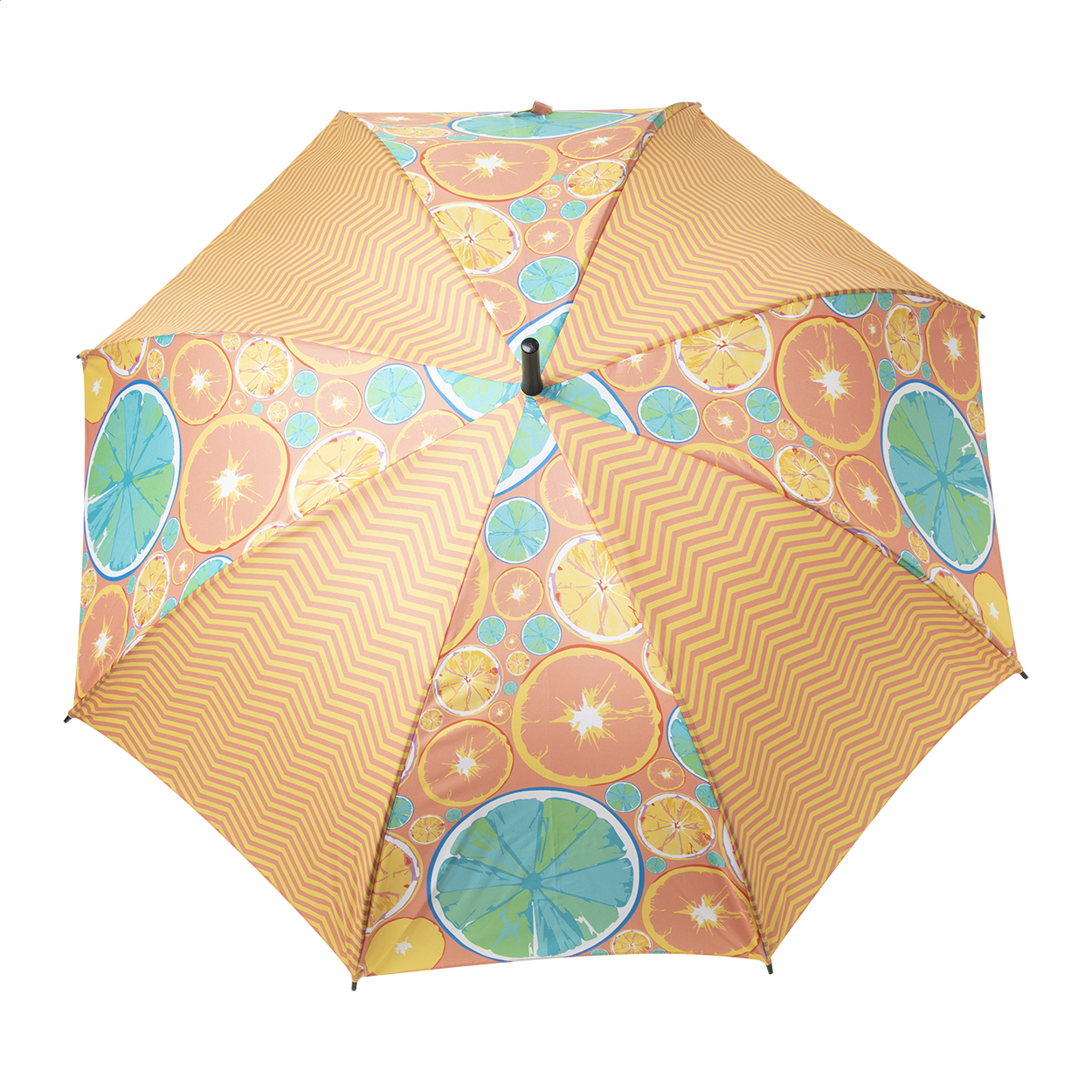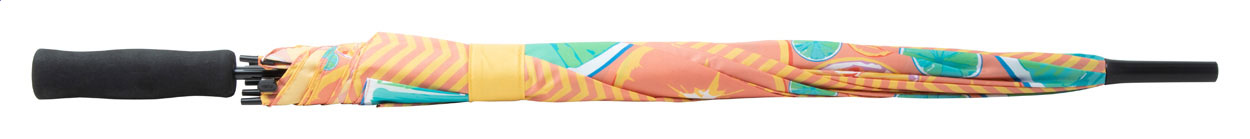 Custom made, 8 panel automatic umbrella with metal shaft, fibreglass ribs and EVA handle. 190T pongee. With sublimation printed graphics on all panels. MOQ: 50 pcs.