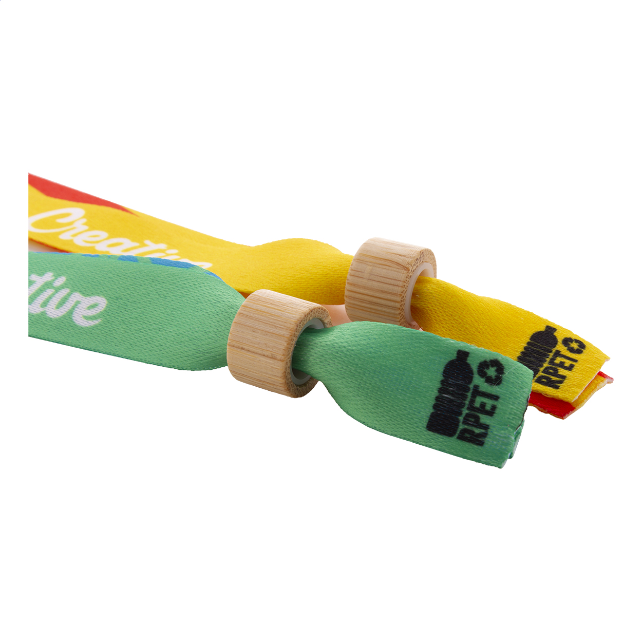 Custom made, RPET polyester festival bracelet with bamboo safety lock. With sublimation printed graphics on both sides. MOQ: 100 pcs.