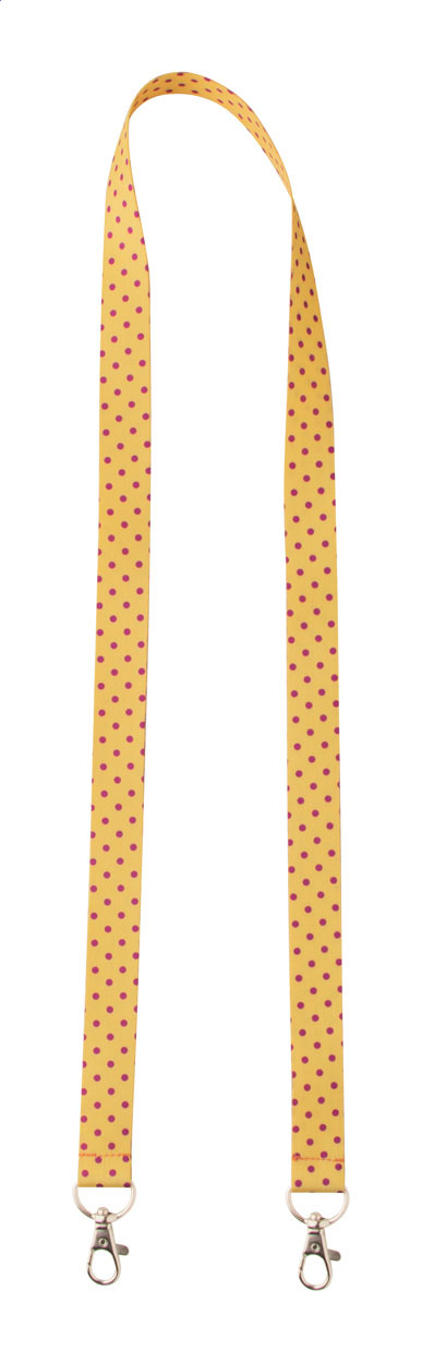 Custom made, polyester lanyard with 2 metal carabiners. With sublimation printed graphics on both sides. MOQ: 100 pcs.