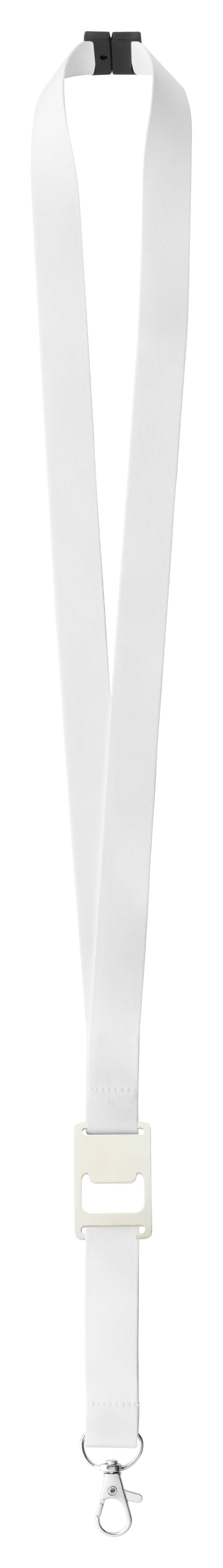 Custom made, polyester lanyard with metal carabiner, bottle opener and safety buckle. With sublimation printed graphics on both sides. MOQ: 100 pcs.