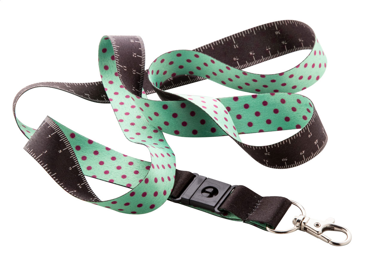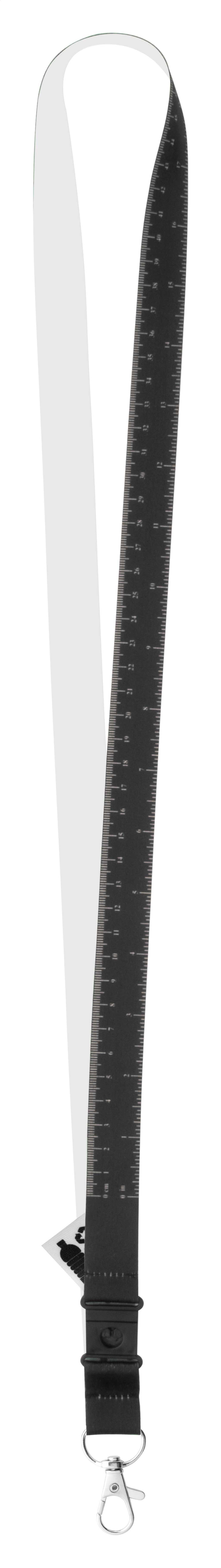 Custom made, RPET lanyard with 100 cm tape measure and metal carabiner. With sublimation printed graphics on one side. MOQ: 100 pcs.