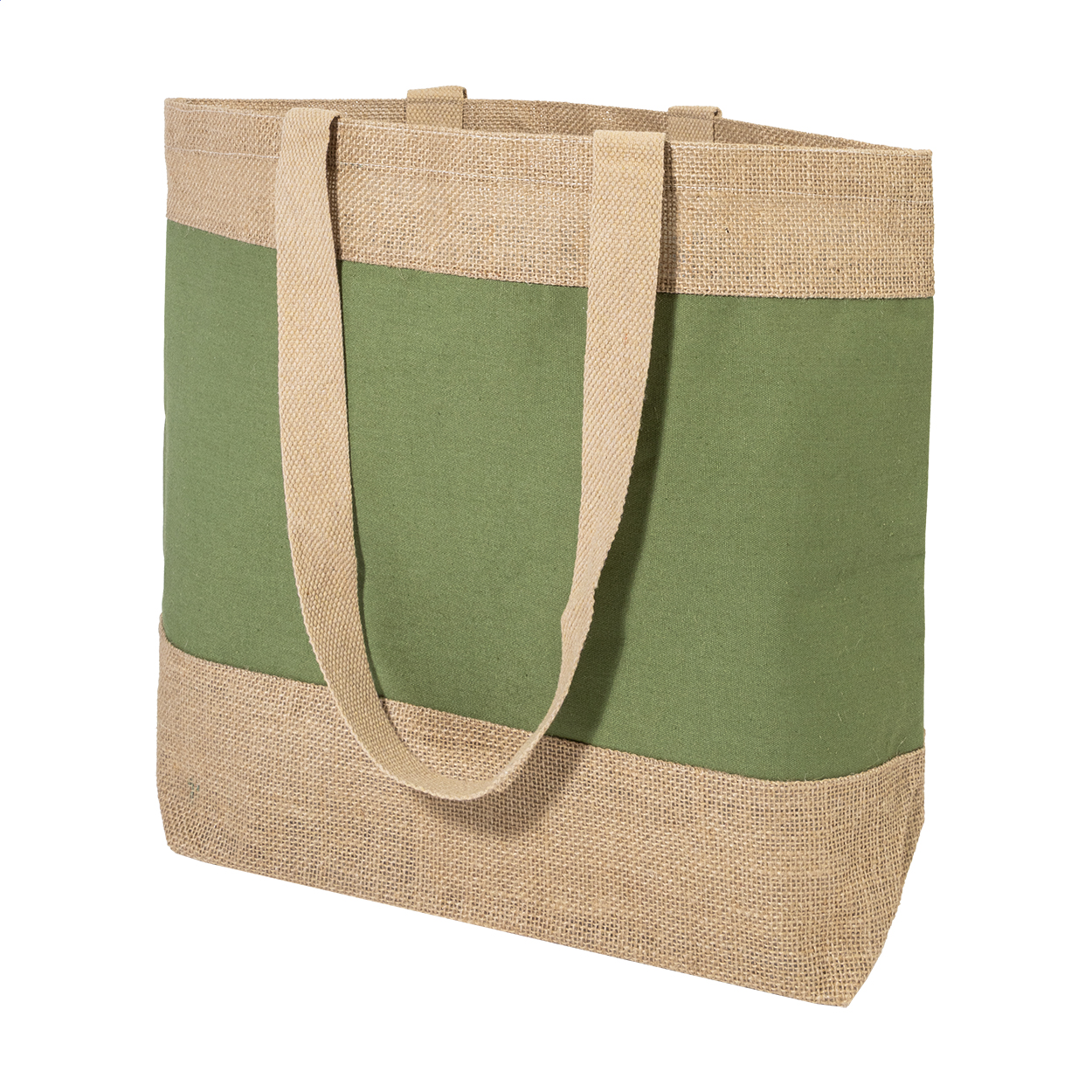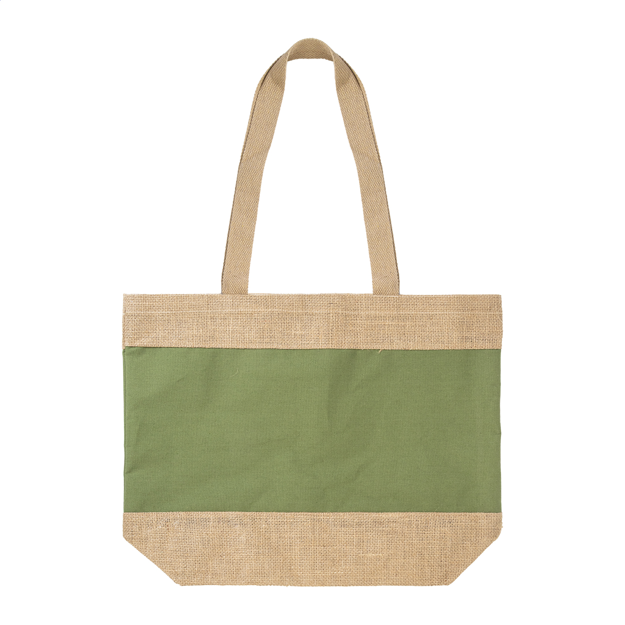 Coloured beach bag in combination of laminated jute and laminated cotton with long handles.